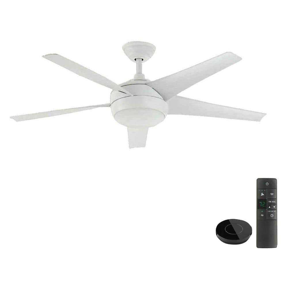 Easily integrate fan and light control into your Amazon or Google smart home system with this Bond ceiling fan bundle. The Bond remote hub pairs with Alexa or Google Home to add voice control convenience to your ceiling fan. The patented High-Efficiency Blade System of the Home Decorators Collection 52 in. Matte White Windward IV saves up to 75% more energy and moves up to 40% more airflow than standard fans while allowing for ultra-quiet, wobble-free operation. This simple, yet contemporary design has a light kit with frosted opal glass bowl and includes two 9.5-Watt LED bulbs. The fan’s steeper 29-degree blade pitch provides greater air movement and features a three-speed reverse function for year-round comfort and savings. The thermostatic remote with digital display controls the speed of your ceiling fan (high, medium, low) and the light. The remote includes a programmable feature that allows the fan to automatically turn on and off when the room reaches a desired temperature.