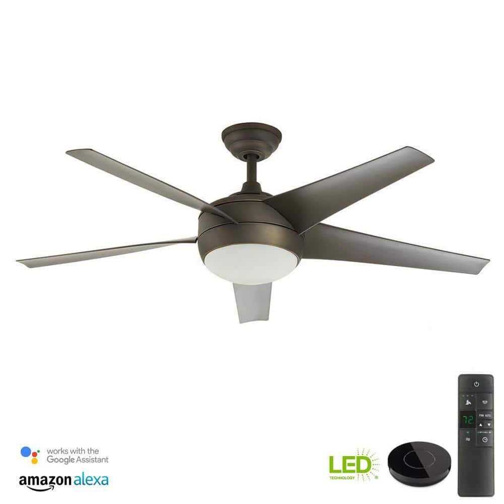 Easily integrate fan and light control into your Amazon or Google smart home system with this Bond ceiling fan bundle. The Bond remote hub pairs with Alexa or Google Home to add voice control convenience to your ceiling fan. The patented High-Efficiency Blade System of the Home Decorators Collection 52 in. Oil-Rubbed Bronze Windward IV saves up to 75% more energy and moves up to 40% more airflow than standard fans while allowing for ultra-quiet, wobble-free operation. This simple, yet contemporary design has a light kit with frosted opal glass bowl and includes two 9.5-Watt LED bulbs. The fan’s steeper 29-degree blade pitch provides greater air movement and features a three-speed reverse function for year-round comfort and savings. The thermostatic remote with digital display controls the speed of your ceiling fan (high, medium, low) and the light. The remote includes a programmable feature that allows the fan to automatically turn on and off when the room reaches a desired temperature.