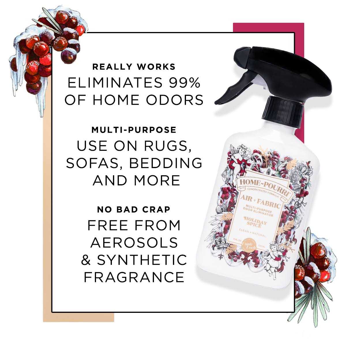 Limited Edition Holiday Scent: cranberry + cinnamon + balsam fir. Size: 11 FL Oz bottle with trigger sprayer.