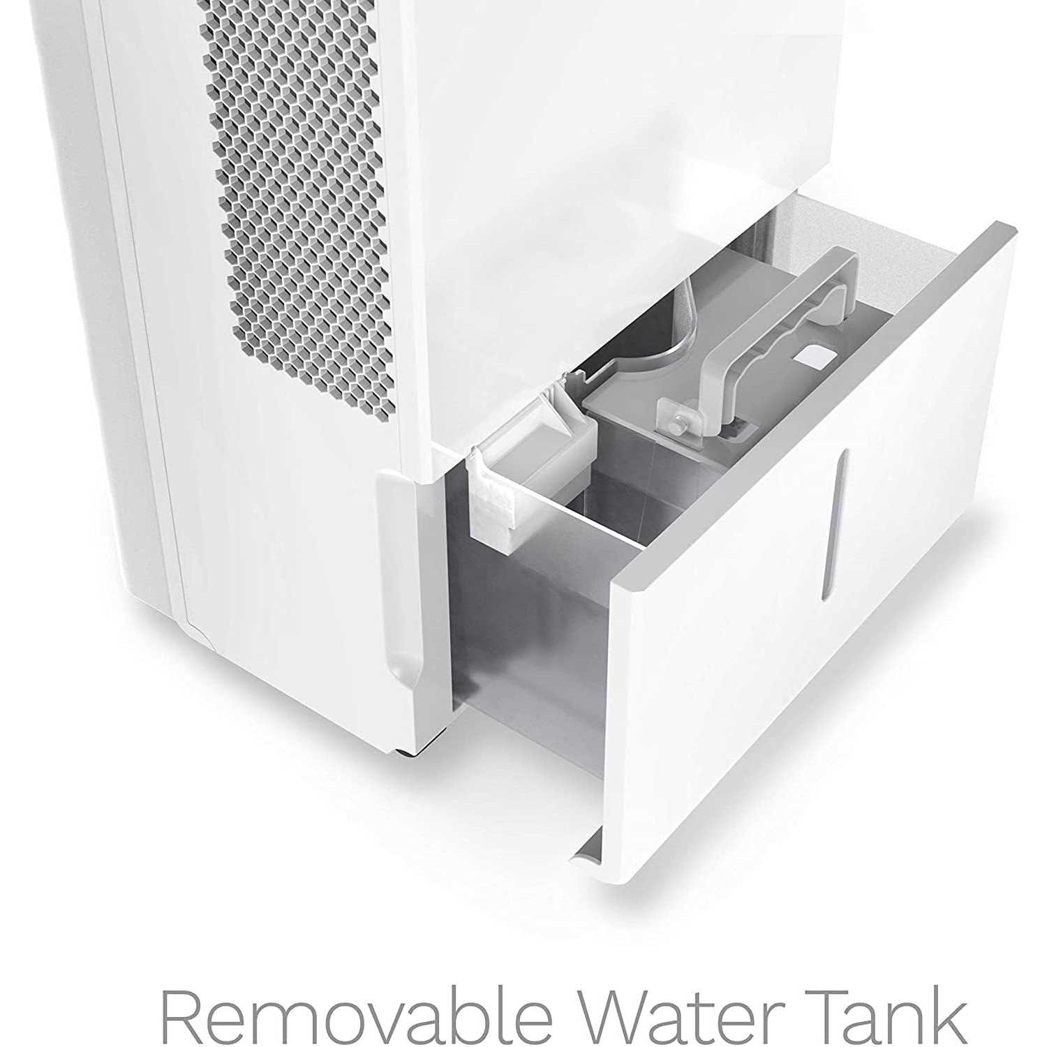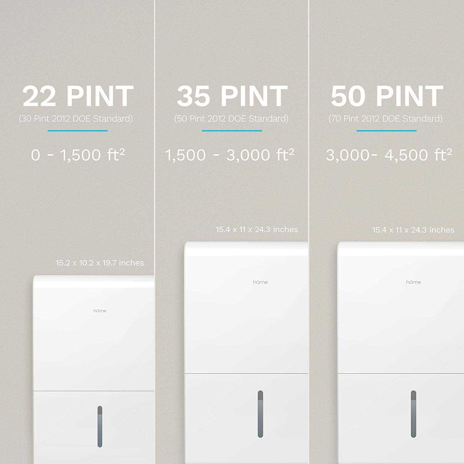 Product Details Size: 15.4 x 11 x 24.3 in Weight: 40 lbs Rated Current: 4.7 Amps Moisture Removal: 50 pints per day Air CFM Range (cubic feet per minute): 165 (Normal) to 188 (Turbo) Removable Water Tank Capacity: 1.6 gallons / 6 liters Certifications: UL & Energy Star rated Includes: Washable Filter, Built-in Handles and Wheels, Drain Hose Outlet Features: Touch Control Panel; Auto Restart, Shut Off, Defrost; Turbo Mode; Continuous Dehumidifying; 24-hour Timer; Custom Humidity Level from 35% to 85% Best For: Spaces between 3000 and 4500 square feet, with room temp from 41? F to 95? F Product Care and Use WATER REMOVAL: (Manual) Turn off when water tank is full, then remove tank from Dehumidifier and empty bucket. (Continuous Draining) Attach dehumidifier drain hose outlet to internal-threaded end of standard water hose before use OPERATION: Dehumidifier automatically enters 3-minute rest period after completing a moisture removal cycle. Do not start dehumidifier during rest period. Operation starts again automatically when rest period is complete NOISE REDUCTION: Position dehumidifier on level surface and ensure air filter is not clogged IMPORTANT: Like most dehumidifiers, our 50 Pint model emits dry hot air from its fan during moisture removal. Use in large rooms or basements with minimum of 3,000 sq ft to prevent significant increases in surrounding air temperature.