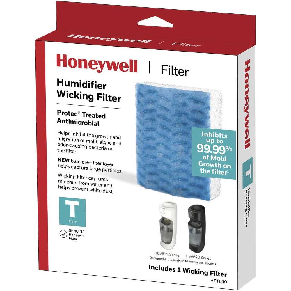 Air Purifier Parts & Accessories by Honeywell. Details: It uses a patented design that helps inhibit 99.99%* of growth and migration of particles on the filter. A blue pre-filter layer helps capture large particles. The Honeywell “T” wicking filters work with Evaporative Honeywell Top Fill Tower humidifier models HEV615 and HEV620. Using humidifiers helps to ensure proper humidity levels in your home. Indoor humidity levels between 40-60% can help relieve cough and congestion, keep throat and nasal passages hydrated and more. They can be especially helpful during cold and flu season, when it’s difficult to sleep with cough and congestion. A humidifier or vaporizer can provide temporary relief by adding necessary moisture to the air. For best performance, use only Genuine Honeywell humidifier filters. Independent Laboratory Testing.