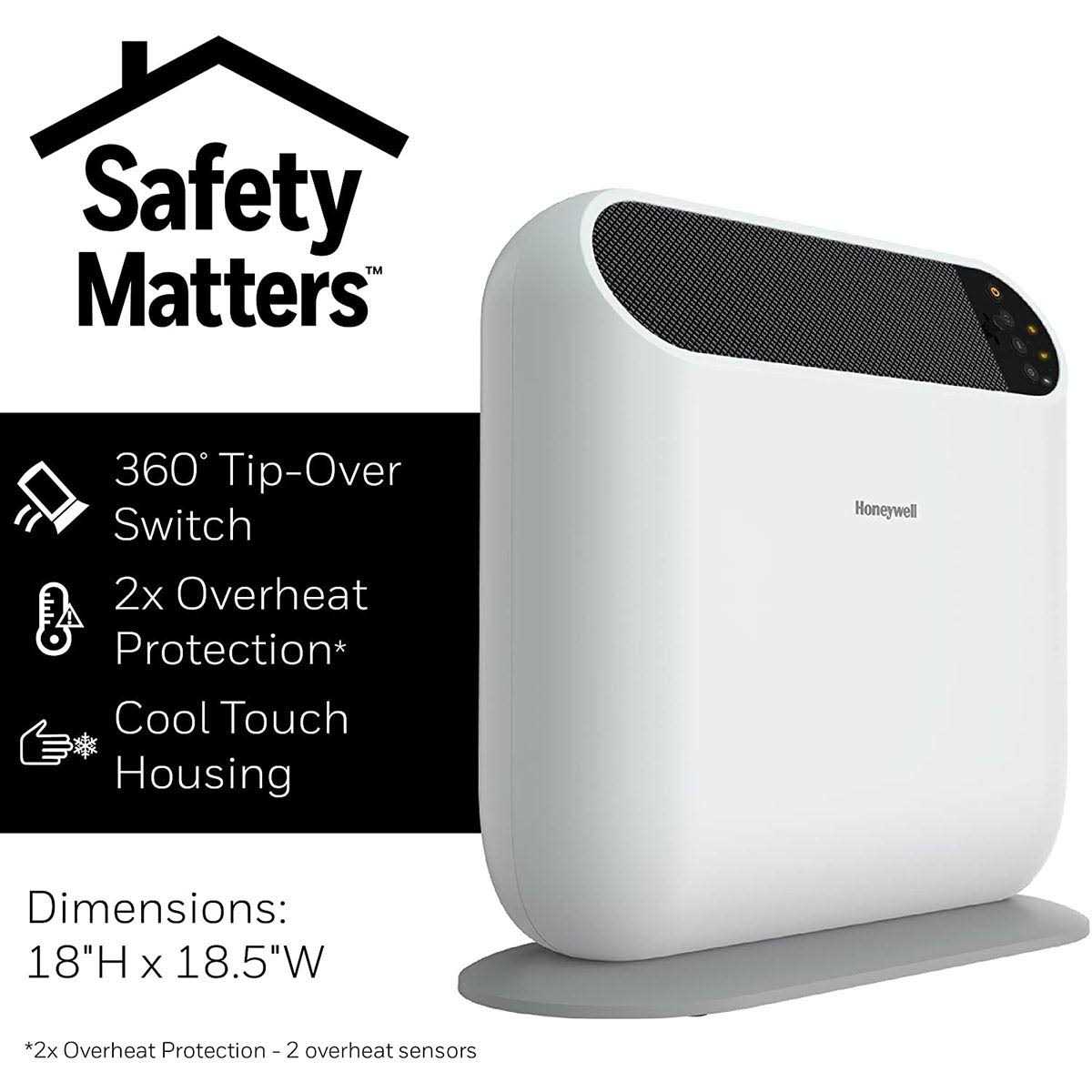 Take control of your comfort with the Honeywell ThermaWave 6 Ceramic Space Heater. Use it in any room of your home for powerful and comforting heat. It is ideal for a living room, family room and as a heater for a bedroom. This small heater also features a programmable thermostat, two heat settings (high and low) and a fan only option, plus directional heat control. When it comes to your family, safety matters. The room heater also offers added protection with multiple safety options including 2x Overheat Protection, 360 tip over protection, cool touch plastic housing, thermal insulated wiring, reinforced wire connection, high temp plastic and auto shut-off. It also features easy-to-use digital controls. With a space heater, you can even save money and energy! By turning down your whole house thermostat a few degrees and heating just the room you are in, a Honeywell small heater can help you save money while providing soothing warmth.