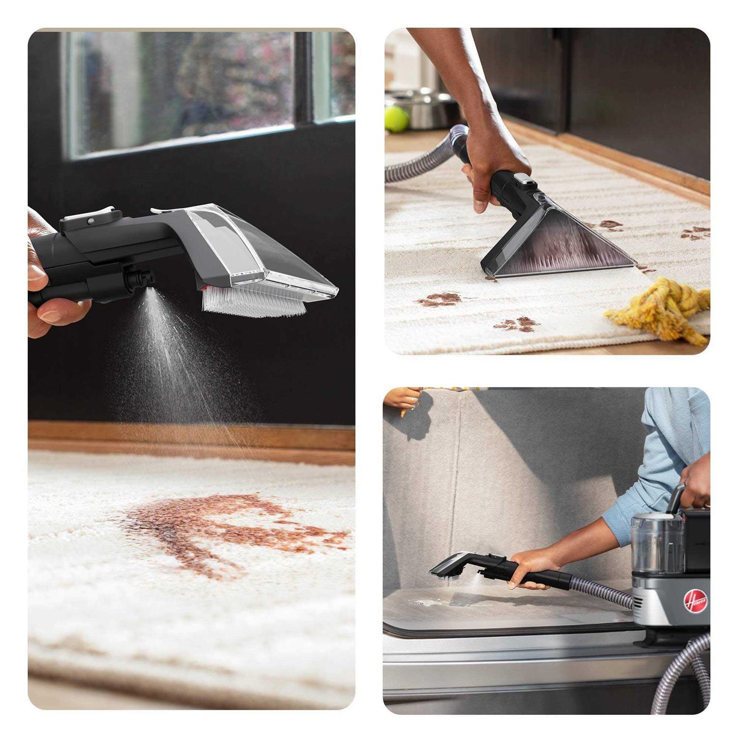 Experience complete freedom with the Hoover ONEPWR CleanSlate Cordless Spot Cleaner powered by the 4.0Ah ONEPWR battery. Get whole-home portability with uncompromised power delivering the same deep clean for up to 25 minutes of continuous, fade-free run time, thanks to the 4.0Ah battery. Boost Mode offers 25% more suction and picks up 20% more liquid with each pass, blasting away tough, colored stains like wine, pasta sauce and coffee on all your carpeted upholstery surfaces in the home and in the car. The build-in spotlight helps illuminate hidden spots and stains for a complete clean. Accessories include a Tight Spot Tool for hard-to-reach spaces like crevices and corners, while the 7” WidePath Tool includes interchangeable rubber nubs and bristles that scrub away embedded stains, perfect for large areas like cushions and stairs. The quiet HushTone System delivers a quieter clean without compromising performance with a brushless motor. The easy-empty dirty water tank and built-in hose rinse tool keeps clean-up hassle-free.