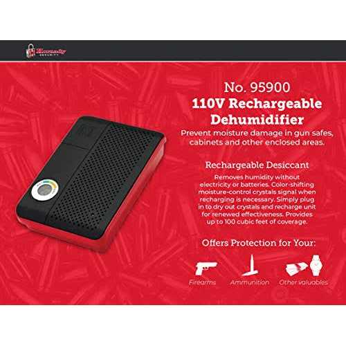 The Hornady Rechargeable Gun Safe Dehumidifier Absorbs humidity and prevents rust or mildew in gun safes or other enclosed areas. Moisture-control crystals change color when unit needs recharging. Recharge by plugging into 110V electrical outlet. Safeguards firearms and other valuables from mold and mildew. Eliminates humidity in enclosed spaces up to 333 cubic feet. Quick-connect bracket makes mounting unit easy in gun safes, closets or pantries. Removes humidity without electricity or batteries. Color-shifting moisture-control crystals signal when recharging is necessary. Simply plug in to dry out crystals and recharge unit for renewed effectiveness. Contains no harmful chemicals — child, pet and home safe.