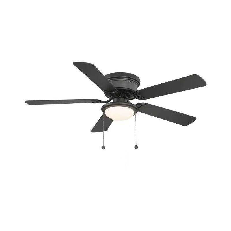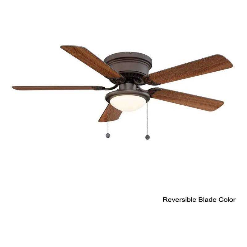 Featuring a sleek finish, the low-profile design of the 52 in. Hugger Ceiling Fan offers the perfect accent of functional style for your living space. Ideal for flush-mount installations when ceiling height is of concern, this efficient ceiling fan features five reversible blades, all coated in a durable and stylish matte black and complemented by a rich mahogany finish on the other side. The opal-frosted dome light fixture includes a LED bulb and provides optimal illumination. Reversible blades with black finish on one side and mahogany finish on the other Integrated frosted opal dome light fixture Uses (1) 9.5-Watt LED bulb, included 3-speed reversible control for versatile use Designed for interior use Flush mount installation for low ceilings Multi-capacitor for quiet operation and maximum air movement For most rooms up to 14 ft. x 14 ft.
