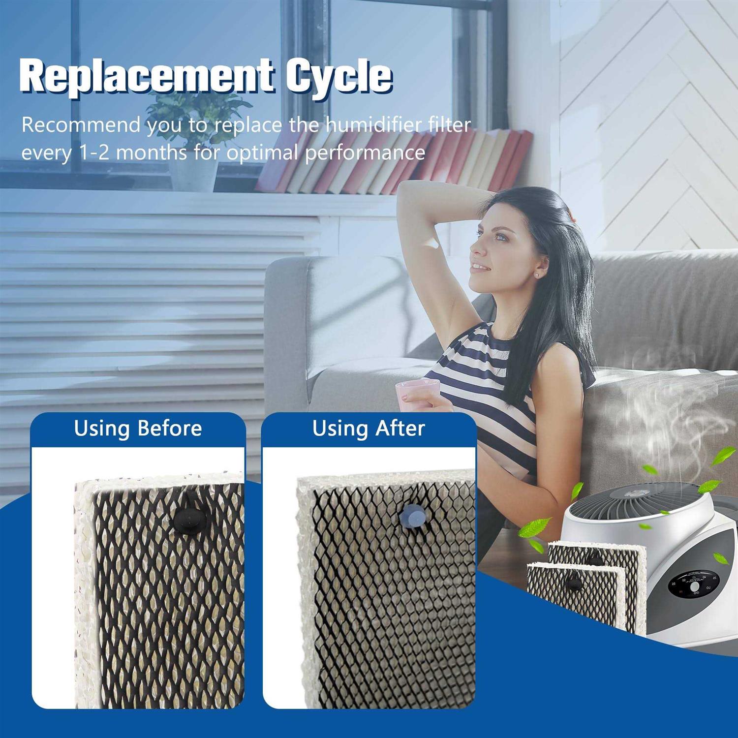 COMPATIBLE MODELS – Our humidifier filter replacement for Holmes HWF100, HM4600, HM6000, HM6000RC, HM6005, HM7203, HM7203RC, HM630, HM729, HM729G, HM7203, HM7203RV, HM7204, HM7808, HM7305, HM7305RC, HM7305RCU, HM7306, HM7306RC, HM7405, HM7405RC, HM7405RCU; Replacement for Bionaire BWF100, BCM5520, BCM5520RC, BCM6010RC, BCM7305, BCM7309, BCM7204, BCM646, BCM645; Replacement for Sunbeam SF235, SCM7808, SCM7809, SCM630, SCM631. Compared to type E SUPER CRAFT – Our compatible with holmes humidifier filter replacement with the hot glue strips and dense construction is made from high-quality reinforced mesh paper and adopts advanced lower density structure technology verified by the manufacturer, less pressure to have the most surface area to displace moisture back into air as you expect. Our humidifier filters selected environmentally friendly materials can increase the use time of the filter and bring you a healthy life guarantee EXCELLENT PERFORMENCE – 1Our compatible with holmes humidifier replacement filter can successfully filters impurities in the water and retain the mineral elements needed by the human body. While humidifying the air, it relieves the discomfort caused by the dry environment. 2Prevents white a powder from entering the room air and depositing on everything in sight GREAT VALUE – Package includes 6 x humidifier filter. Warm Tips: For best results, please fill the humidifier tank with distilled water. Excessive use of hard water will degrade filters and cause them to turn yellow prematurely.