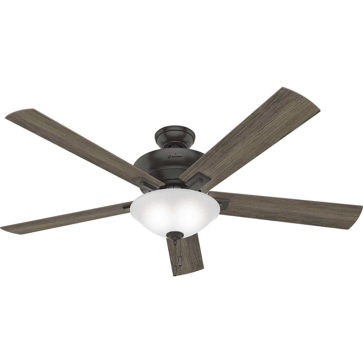 HIGH-SPEED COOLING: Exclusive SureSpeed Technology delivers a high-velocity fan with airflow optimized for ultimate high-speed cooling. QUIET BUT POWERFUL: The WhisperWind motor delivers ultra-powerful air movement with whisper-quiet performance so you get the cooling power you want without the noise you don’t. WINTER AND SUMMER: Reversible motor allows you to change the direction of your fan from downdraft mode during the summer which helps cool the room to updraft mode during the winter to help circulate trapped warm air near the ceiling. MOUNTING OPTIONS: Installer’s Choice three-position mounting system allows for standard, low, or angled mounting based on your room’s requirements. LED LIGHT KIT: Energy-efficient dimmable LED light bulbs let you control the lighting and ambiance of the living space; the long lasting bulbs have longer lifespan than traditional bulbs. PULL CHAINS: includes pull chains for quick and easy on/off and speed adjustments. BLADE PITCH: the degree the blade slices the air is optimized for each fan design; 13 degree blade pitch optimized to ensure ideal air movement and peak performance. INDOOR ONLY: this fan is only rated for indoor spaces only, not safe for outdoor or damp areas. LOCATION IDEAS: Living Room/Great Room, Master Bedroom. Hunter Regalia II 60-in Noble Bronze LED Indoor Ceiling Fan with Light Kit (5-Blade) | 51156