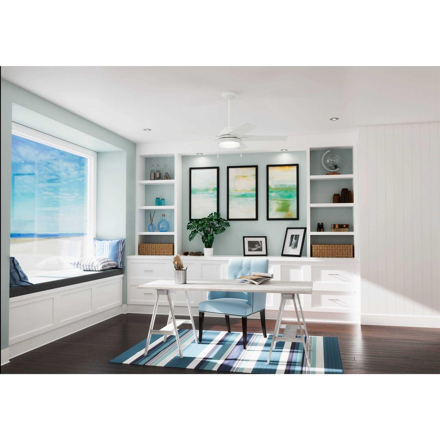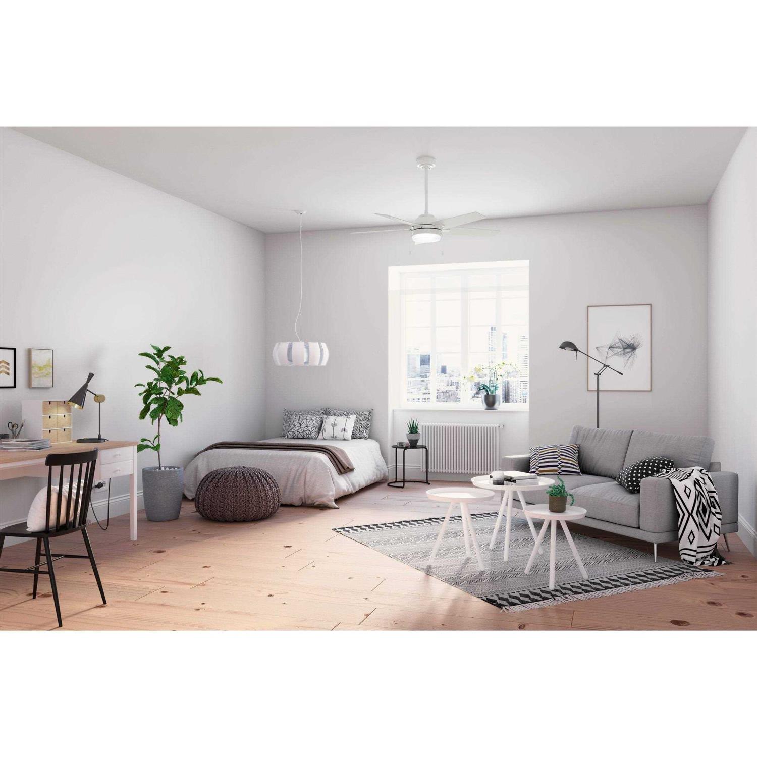 The Bartlett indoor ceiling fan is perfect for casual and soft modern rooms. The Fresh White finish adds a clean look to modern rooms while the Brushed Nickel complements other fixtures in your casual rooms. Available in a variety of sizes the Bartlett Collection allows you to create a cohesive design throughout your home from your laundry room to your living room. Featuring Hunter’s SureSpeed Guarantee this high-velocity ceiling fan is optimized to deliver high-speed cooling. Features: Reversible motor allows you to change the direction of your fan from downdraft mode during the summer which helps cool the room to updraft mode during the winter to help circulate trapped warm air near the ceiling 3 Speeds 13-degree blade pitch optimized to ensure ideal air movement and peak performance Includes 2” and 4” downrods to ensure proper distance from the ceiling and optimize air movement at your preferred blade height Includes Integrated light kit with Painted Cased White glass Includes 2 9W energy-efficient dimmable LED bulbs to give you control of the ambiance in your space Rated for indoor spaces only Material: Metal.