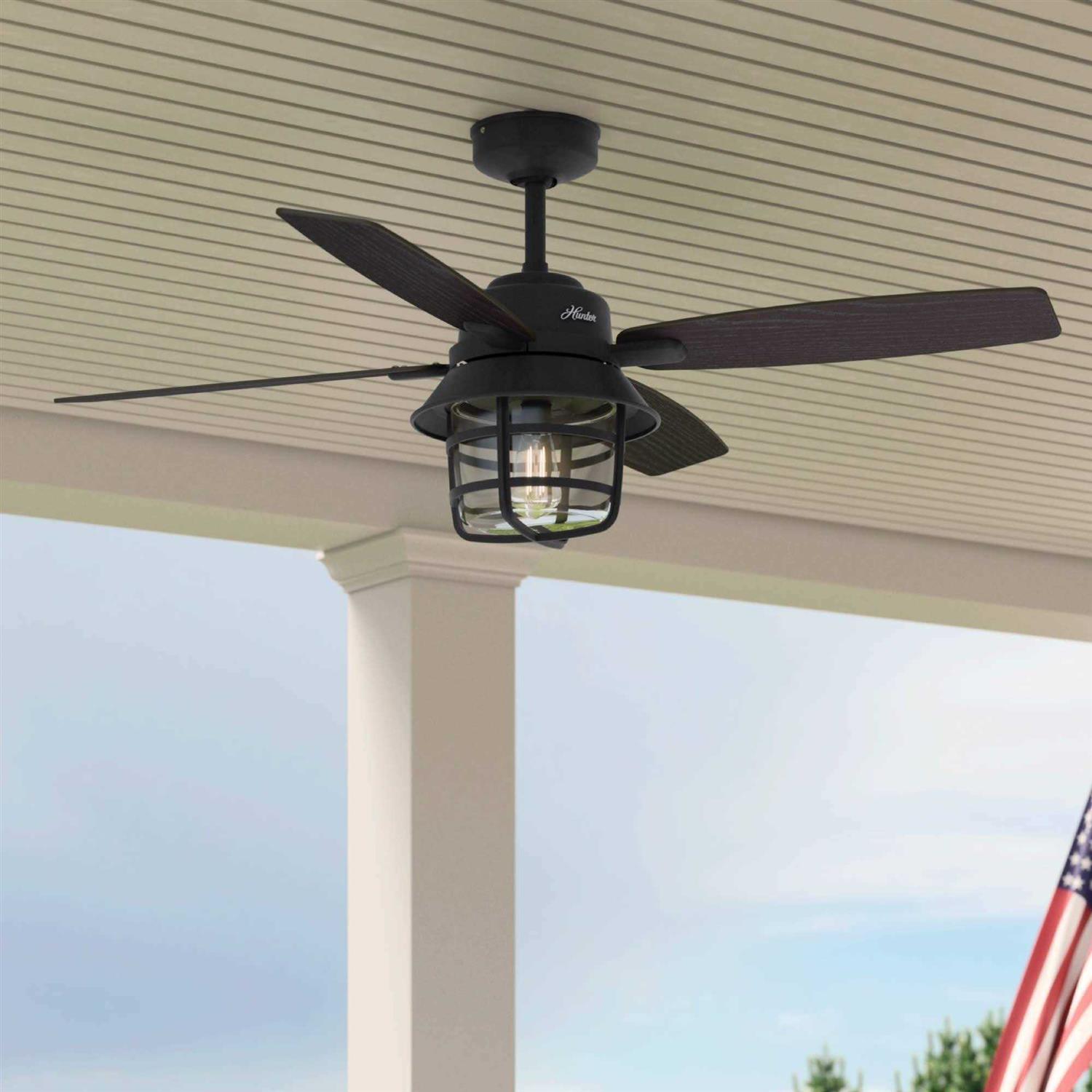 Powerful WhisperWind motor quietly generates optimal airflow using 3-speeds with reverse feature providing year round comfort. 3-speed remote control included with full-range light dimming with wall cradle doesnt include blade direction reversing. Reversible black willowwalnut stripe blades included that operate on a 13 pitch for maximum performance. 7-watt light fixture using one 7-watt medium base E-26 dimmable LED Edison style bulb included must be installed with light kit. Can be installed using the provided 2-in downrod for low or standard ceiling heights and also on a longer downrod for higher ceilings can accommodate angled ceilings up to 34. ETL Damp Listed for use in covered porches patios and sunrooms. Features stainless steel hardware to resist rust.