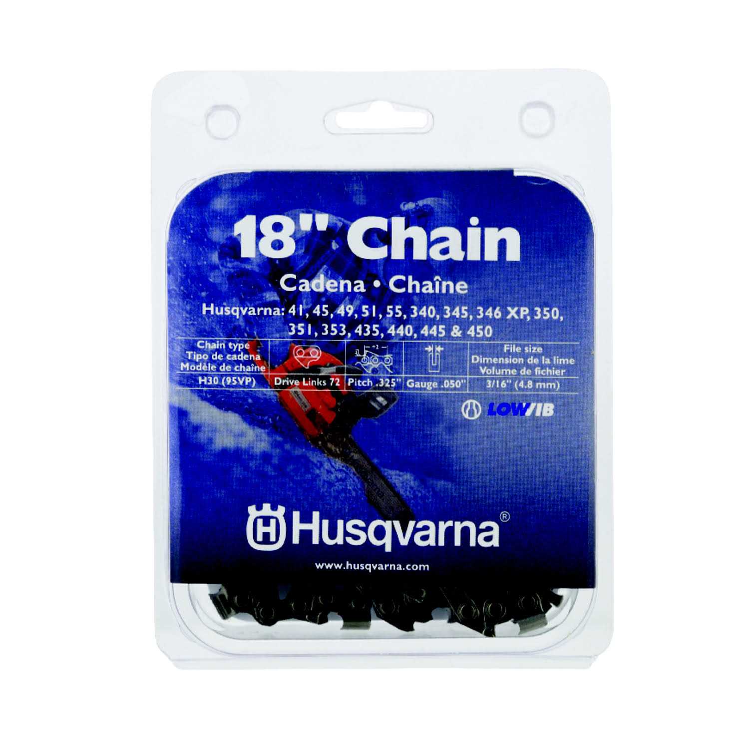 Husqvarna 531300439 18-Inch H30-72 (95VP) Chainsaw Chain A low kickback, low-vibration chain developed to meet the specific needs of today’s lightweight chainsaws. It cuts a narrow kerf and requires less power from the saw than standard cutting systems. Not recommended for heavy duty work, e.g. storm damaged forests.