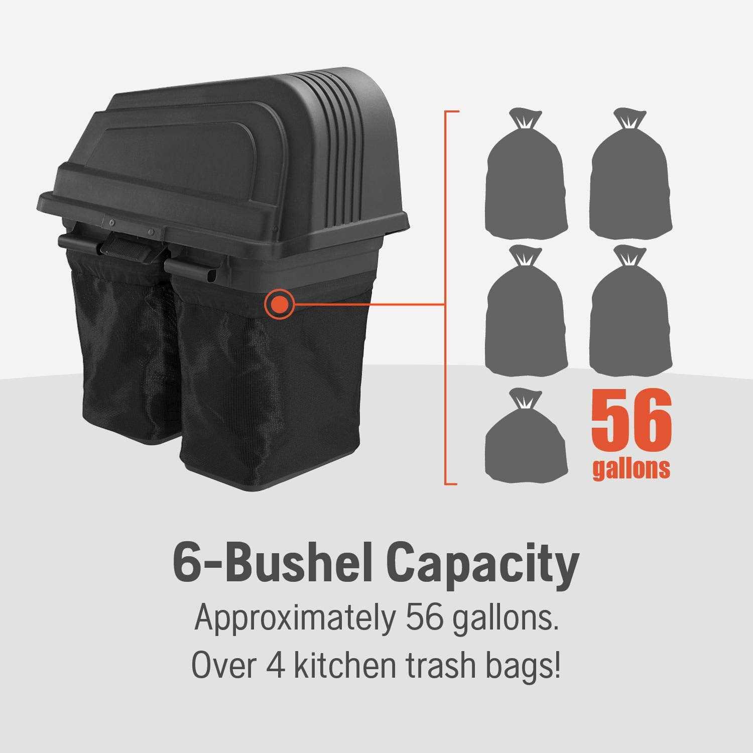 Make your lawn look pristine for the summertime! With this beautiful 2-Bin 42 Lawn Tractor Bagger from Husqvarna you can make that happen Perfect for tractors with a 42 cutting deck this tractor attachment saves you time and back work by filling and dumping this bagger with several bushels of clippings at a time. This soft bagger ensures your grass will get the right amount of water and oxygen that it needs for a healthy looking lawn. In addition this feature’s improved airflow results in fuller bags and easy-glide design with built-in handles for easy clipping disposal. Simply lift dump and refill. This feature has the added benefit of being a helpful cleaning tool while also being easily accessible. Fits Poulan Pro Ariens Husqvarna Craftsman & select models.
