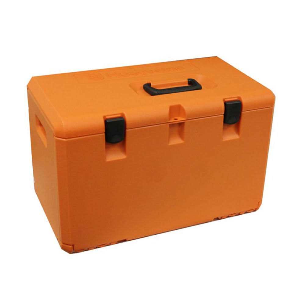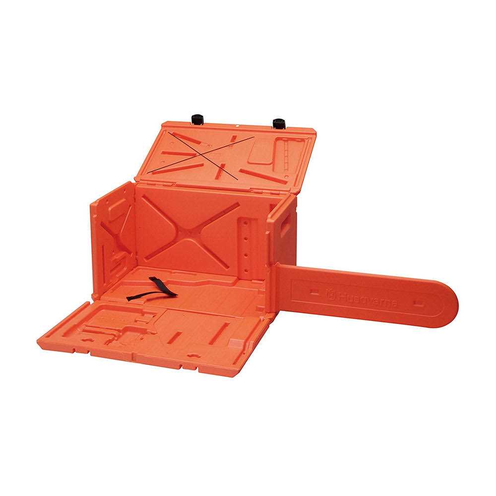 - Orange, stackable and holds Husqvarna’s exclusive filing equipment, filing vise, scrench, spark plug, 2 cycle oil, bar and chain oil.