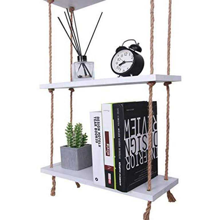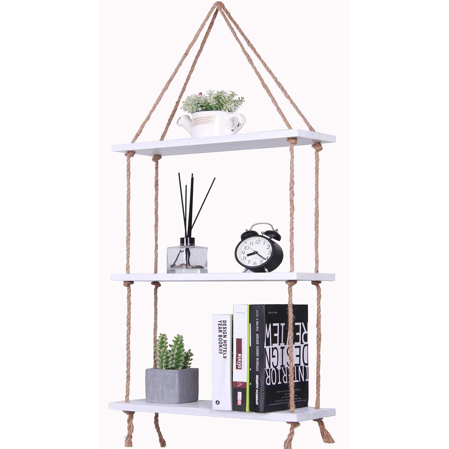 HXSWY Rustic Rope Hanging Shelves for Wall Wood Window Plant Shelf Indoor 3 Tier Rustic White