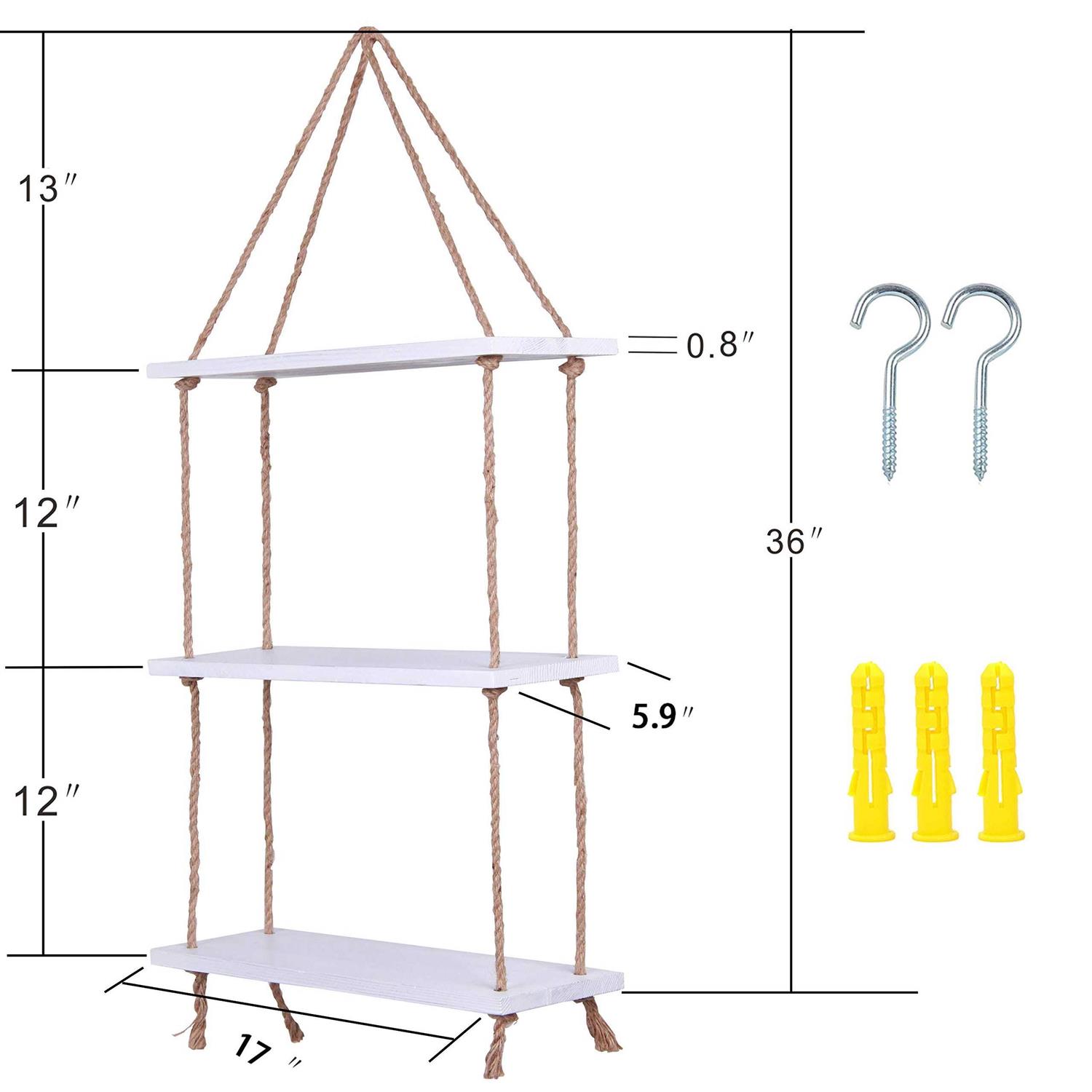 3 Tier Wood Hanging Shelf – The perfect storage and decorate shelf for many rooms in the home. Living room for organize your books, lovely plants or candle, kitchen for storage spices or coffee cups, bathroom to hold towel, makeup or nail polish, bedrooms for display photo frames and mementos. Material: Paulownia wood, jute rope, strong and durable. The props in the picture are not included. Fit Any Space: Can be installed in window or wall space and incorporated easily into any space, like hang it in store to organize special item. Or will be fun in a garden or porch setting to hold your plants! Gift Choice: Shelves transform any small or unused space into beautiful displays, perfect for housewarming or unique baby shower gift. Total height is 34″, approximately 8.5″ between shelves, can be adjusted by moving the knots. Wood shelf is 17″ in length, 8″ in width, 5/8″ thickness.