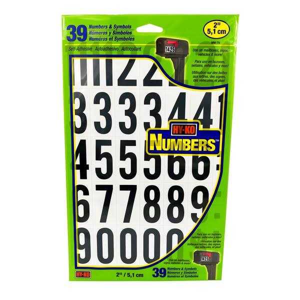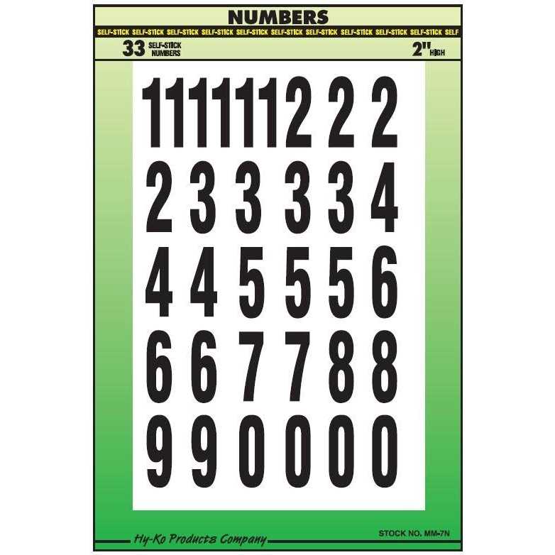 Hy-Ko Vinyl Numbers. 2″. Black on white. 33 per card. Self adhesive.