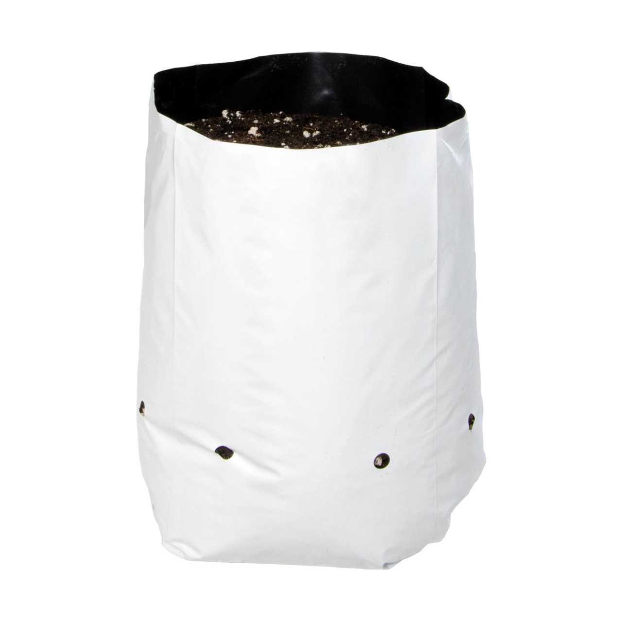 White/Black Grow Bags This update to our classic Hydrofarm grow bags features a new durable white plastic outer layer – so you can write details like plant type, planting dates and growing notes, right on the bag! The white surface also reflects light, helping keep plants’ roots cooler. These bags are a great low-cost alternative to plastic pots used by greenhouse growers. And as always, they’re made from a specially formulated plastic that provides for a longer life than any other on the market. The bags have pre-punched holes for easy draining and stand upright when filled with media. They are widely used in greenhouse drip irrigation applications, and they’re ideal for residential growers too! Try them with bedding plants, tree seedlings, tomatoes, bell peppers, cucumbers, and more. When filled with media, the bag becomes a cylinder shape.