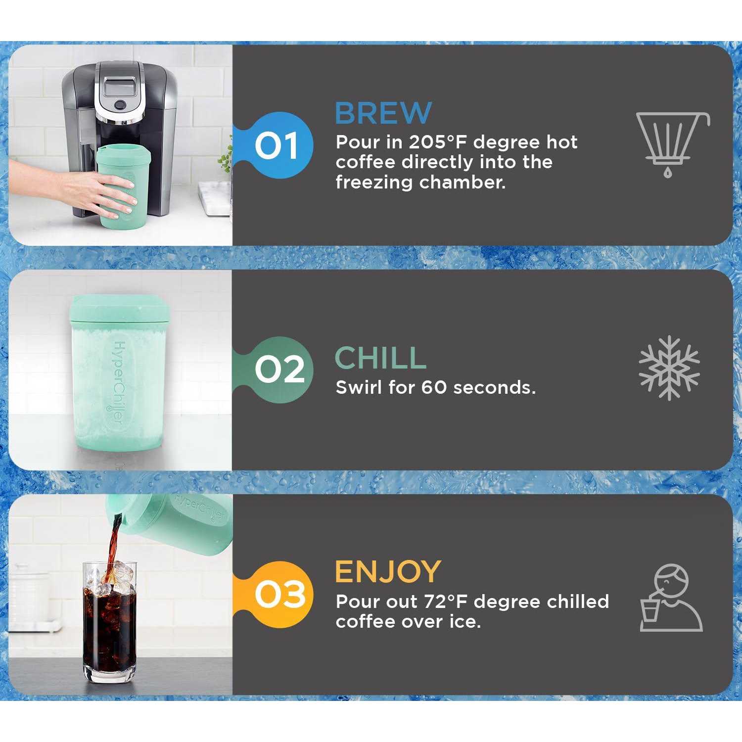 Rapidly chill fresh, hot coffee in a minute without dilution from ice cubes! Can you imagine brewing a cup of hot coffee and immediately being able to turn it into delicious fresh ICED coffee in just 60 seconds? The HyperChillers patented design contains two chambers of ice that you keep in your freezer until its ready to be used. You can brew directly into the HyperChiller or pour hot coffee into a third 12.5oz. chamber that is surrounded by the two frozen sections. Swirl the Hyperchiller to chill the hot coffee, and thats it! In just 60 seconds, your hot coffee is ready to enjoy! Pour into a serving glass, add your creamer or additional ice and voila, you have instant gratification! Just think about all the time and money you will be saving! Its fast and simple to use. The HyperChiller is compatible with most brewing methods, some even allow it to fit directly beneath a coffeemaker to brew and dispense directly into it. Its not all about coffee, you can chill tea, juice, wine, spirits or other favorite beverages. Clean up is so easy that all it needs is a simple rinse or place all pieces in the dishwasher.