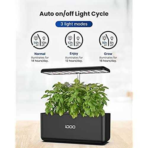 Hydroponic Circulation System This indoor garden germination kit is designed with a water circulation system, increasing the oxygen in water. Growing in the nutrient water faster than soil. You have total control over the weather all year round. High-Performance Grow Lights The 24-Watt LED lights of the hydroponics growing system simulate the sunlight spectrum, promoting veggies photosynthesis in any weather. the indoor gardening with veggies can be placed in the kitchen, bedroom or office. The indoor garden kit is an educational gift for children, helping them to observe the process of growth. Parents and grandparents will also love year-round fresh veggies. 3 Smart Modes for Different Growth Stages NORMAL MODE 14h-on-and-10h-off-cycle, with red amp blue amp white LED lights, suitable for germination, bloom, viewing stage. GROW MODE 16h-on-and-8h-off-cycle, with red amp white LED lights, for germination and viewing stage. ENJOY MODE 12h-on-and-12h-off-cycle, with 50 red amp white LED lights, good for germination, bloom, viewing stage. Lights will be less noticeable in this mode.