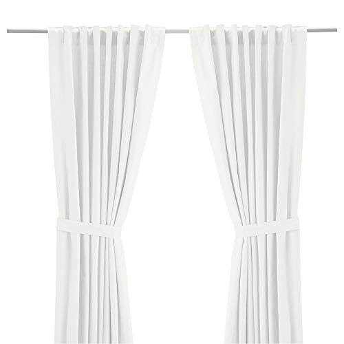 The curtains lower the general light level and provide privacy by preventing people outside from seeing directly into the room. The curtains can be used on a curtain rod or a curtain track. The heading tape makes it easy for you to create pleats using RIKTIG curtain hooks (Hooks sold separately). You can hang the curtains on a curtain rod through the hidden tabs or with rings and hooks. Good to know Contains 2 panels with tie-backs. The measurement applies to each curtain panel. Care instructions Machine wash very hot normal cycle. Do not bleach Tumble dry medium normal cycle Iron high Do not dry clean Shrinkage 4%.