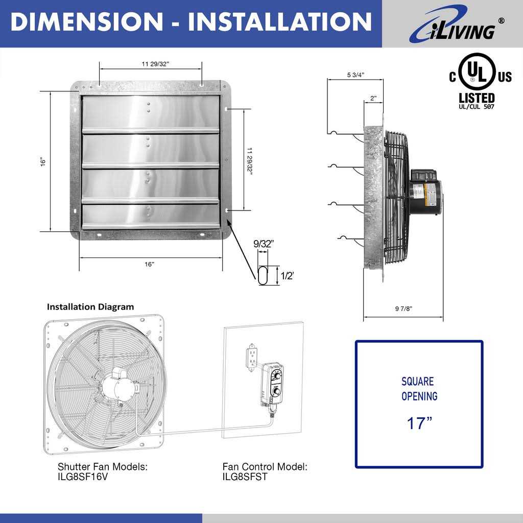 The iLIVING Shutter Exhaust Fan is perfect for removing excess heat, moisture, and unpleasant odors from virtually any commercial location, including restaurants, factories, warehouses, barns, and greenhouses. This fan features aluminum blades, OSHA compliant wire guards, and automatic shutters that open and close in tandem with the operation of the fan. The completely enclosed motor is thermally protected and permanently lubricated. Equipped with the newest Thermospeed Controller which can easily control the temperature and speed. Auto cycle ON/OFF at your desired temperature. The fan comes fully assembled out of the box; only installation required is the electrical hardwiring.