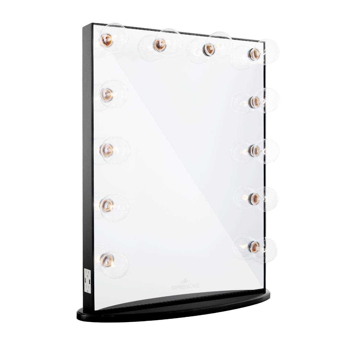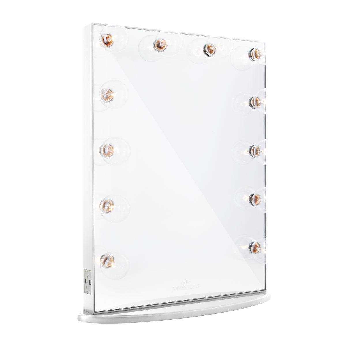 Overview The industry-leading bestselling Impressions Vanity Hollywood Glow XL Vanity Mirror is the perfect size and layout for vanity stations. The Hollywood Glow XL’s versatility is only matched by its flawless lighting prowess, inspiring elegance and innovative one-of-a-kind modern Hollywood design. The exclusive patented Impressions Vanity Hollywood Glow Frame design is unmatched in its simple sophistication Hollywood-style lighting is timeless aesthetic that provides perfectly even studio-quality illumination Upgrade to our custom premium LED vanity bulbs for daylight bright white lighting that renders more accurate colors, saves up to 90% energy, and lasts 25 times longer – a smart investment that actually saves you money in the long run No more ugly extension cords! Side-mounted accessory power and dual USB charging outlets for all your beauty accessories and device charging needs Lighting always on fleek with the easy-to-reach dimmer switch for quick and accurate lighting control Beautifully handcrafted with high-quality wood variations that lends to premium feel, weight, and quality Available in our signature Glossy White, Pro Black, Shimmery Silver, Champagne Gold, and Rose Gold premium finishes Detachable base for easy wall mounting (wall mount kit required, sold separately) Minimal assembly required, just screw in the base and bulbs, plug in, and light up! Our flagship line, the bestselling Impressions Vanity Hollywood Glow Series is designed from start to finish and beautifully hand crafted using high-quality materials. Every step performed by top craftsmen within our high-standard facility, our Hollywood Glow Series is masterfully created with signature finishes and glazed with the perfect touch of gloss. Truly an ultimate statement in vanity elegance, our exclusive patented Hollywood Glow Frame design strikes the perfect balance between luxurious classic and ultra-chic modern, birthing a new brand of Hollywood glamour and simple sophistication that has countless makeup lovers, pros and beauty bloggers falling in love. Join thousands of happy owners today and make your every makeup session an ethereal pleasure you’ll fall in love with each and every time! Tag @ImpressionsVanity on Instagram with the hashtag #ImpressionsVanityGlow to submit your photo for a chance feature on our pages! Dimensions Mirror: 23.25 x 31 in. Length: 26.5 in. Width: 8 in. Height: 32 in. Weight: 39 lbs. Bulb Types The main difference between our available incandescent and LED bulbs are the color temperature (glow color). Our incandescent bulbs have a warmer (more yellow) glow while LEDs have a more natural, whiter light as shown in the image* below: *computer rendered approximation, actual appearance may slightly differ LED bulbs also are energy-saving and do not get hot to the touch, unlike traditional incandescent bulbs.