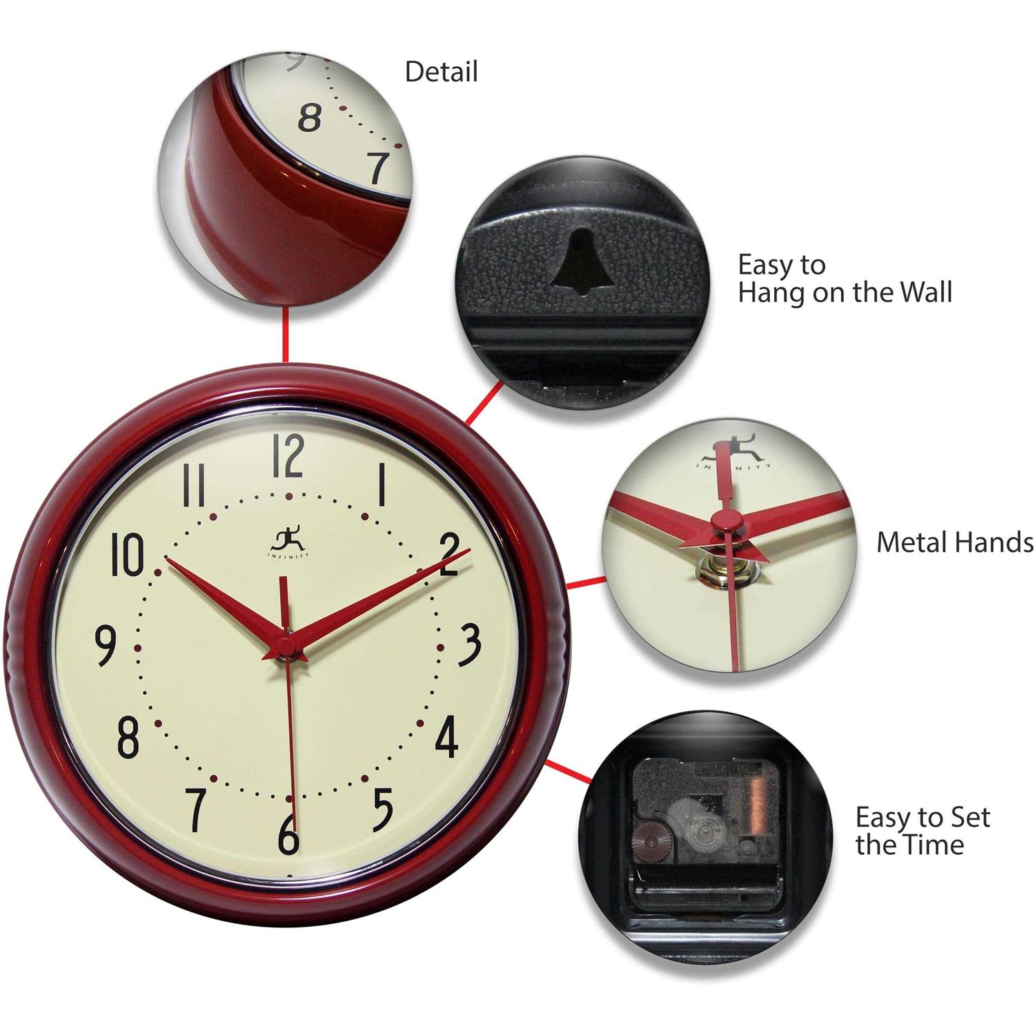 The Retro Round Red Wall Clock’s stunning red frame and unique retro design sets it apart from the rest. Infinity Instruments Retro Wall Clock collection has been a staple in the interior design/wall decor accessories for well over a decade. It has proven the test of time with a clean retro look that fits most, if not all, home decor layouts. There have been many copy-cats but there is only one true Retro Aluminum Wall Clock.
