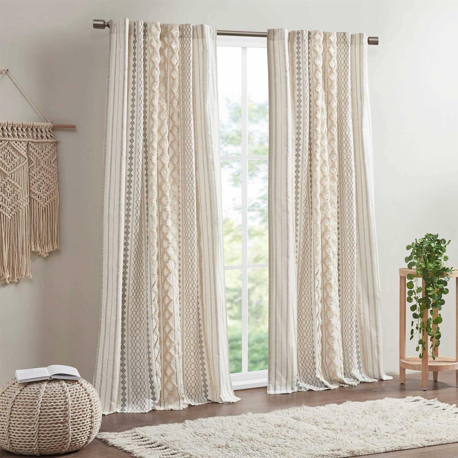 - This ivory window panel features a geometric print with a tufted chenille stripe trim, for a textured artisanal look and feel.