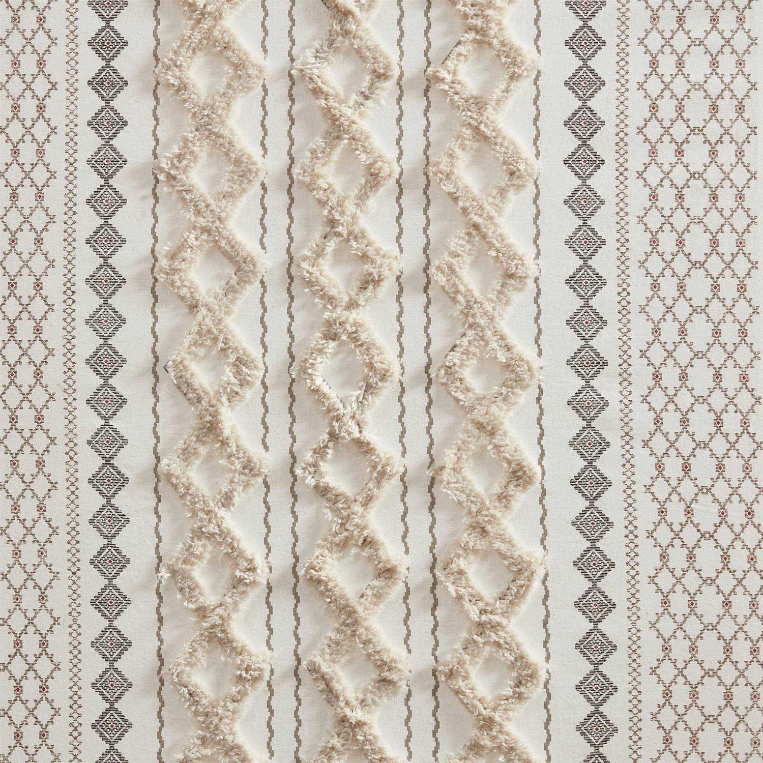 This ivory window panel features a geometric print with a tufted chenille stripe trim, for a textured artisanal look and feel. A lightweight white cotton lining on the reverse softly filters light, while providing better drapability and added privacy. In addtition, this 100% cotton curtain panel is also OEKO-TEX certified, meaning it does not contain any harmful substances or chemicals for the best in quality comfort and wellness. Each panel is finished with a rod pocket top for easy hanging, and back tabs for a more clean and tailored finish. This window panel is sold as a single and 2 window panels must be purchased to cover any standard size window. Complete the look with coordinating bedding sets and bath decor, available and sold separately.