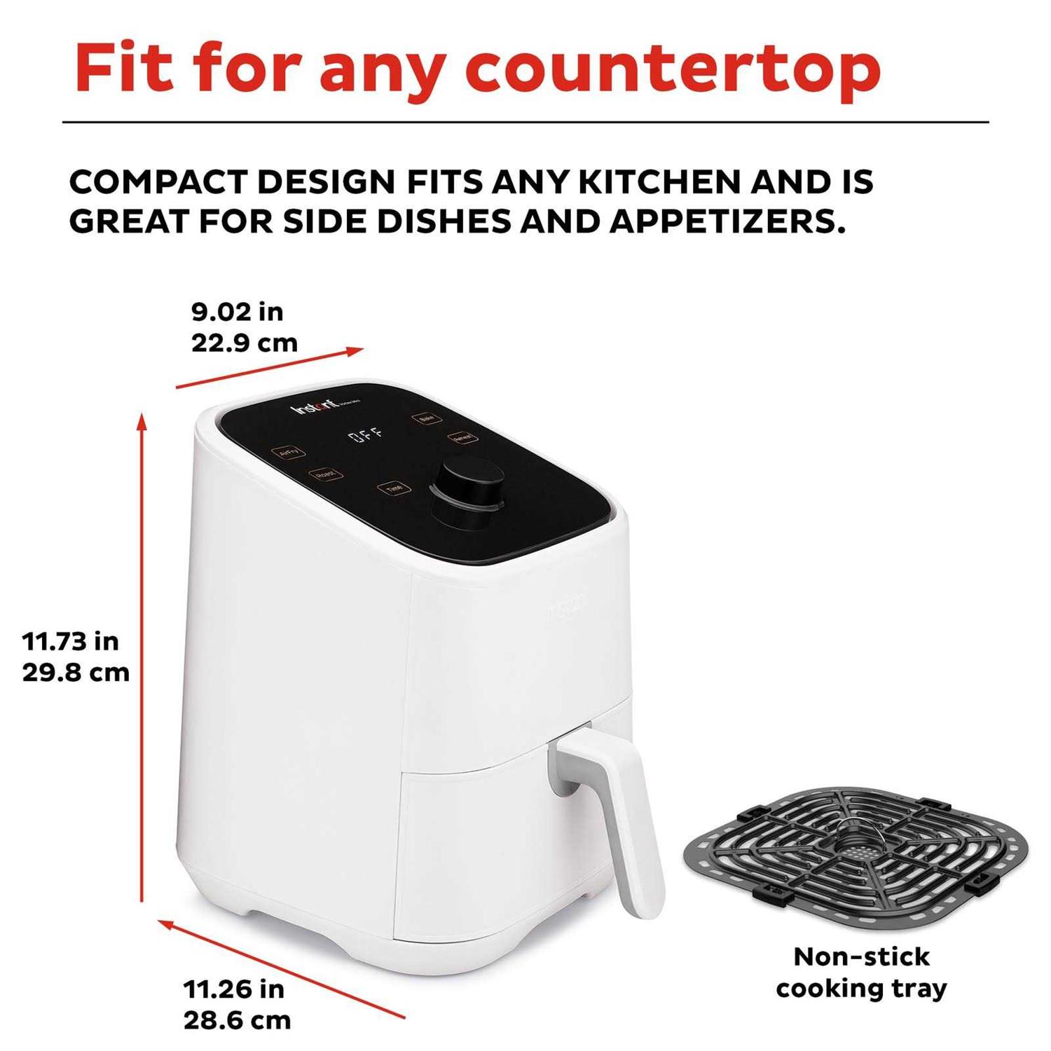 4-IN-1 FUNCTIONALITY: Air fry, broil, roast and reheating. ONE-TOUCH SMART PROGRAMS: Customizable cooking programs for easy chicken wings, roasted veggies, cinnamon buns and more. EVENCRISP TECHNOLOGY: Delivering all the crunch and tenderness of deep-frying with 95% less oil. EASY TO CLEAN BASKET: Non-stick air fry basket holds enough food for a small family. FAST PREHEATING: Little to no preheating time. ADJUSTABLE TEMPERATURE: Easily select temperatures from 95 to 400° F. COMPACT DESIGN: Countertop-friendly size fits any kitchen and is great for side dishes and appetizers. PROVEN SAFETY FEATURES: Built-in safety features including Overheat Protection and auto-off. DISCOVER AMAZING RECIPES: Download our free Instant Pot app (iOS and Android) so you can discover new favorites and prepare delicious meals.