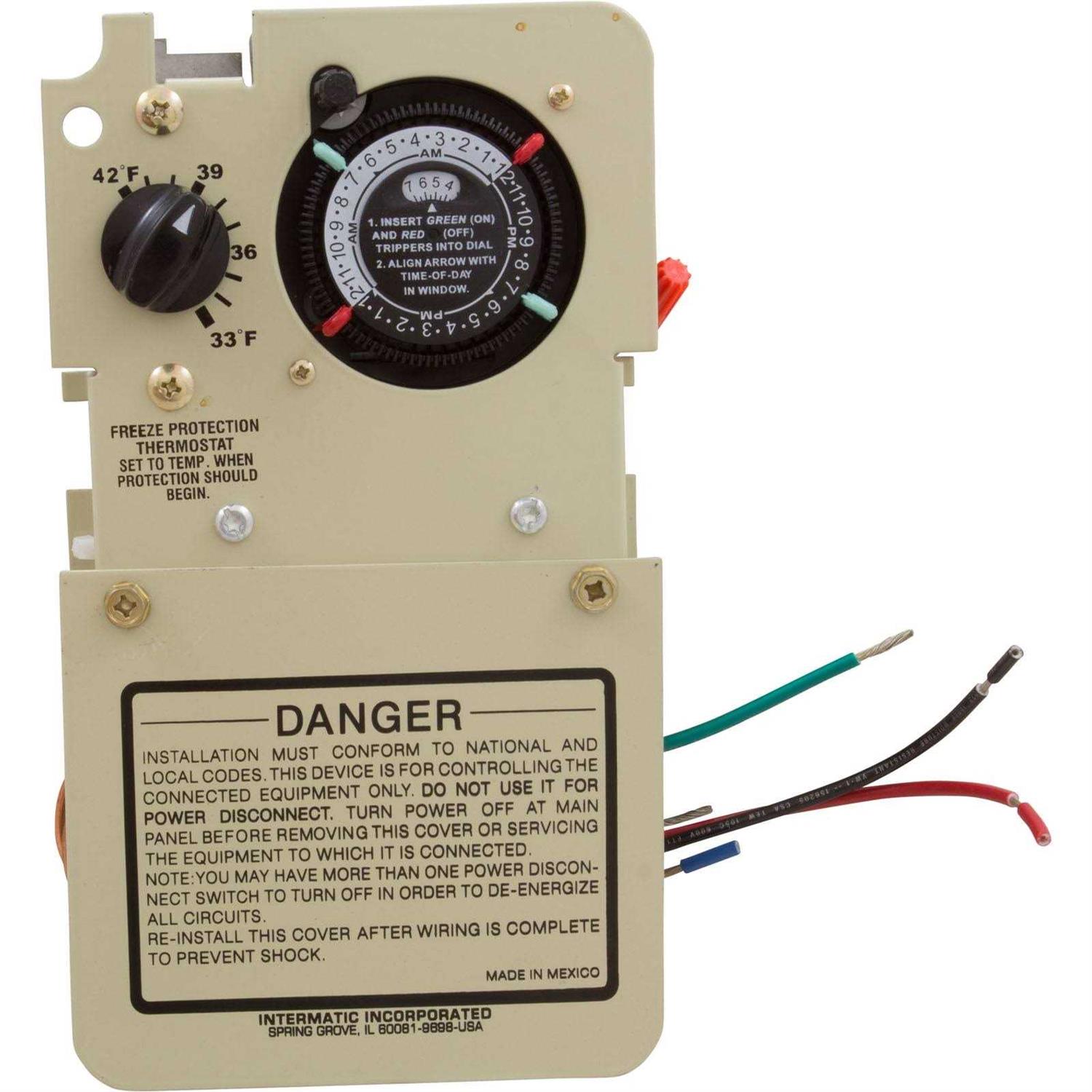 Freeze Protection Controls are designed to protect the pool and spa equipment and plumbing against freeze damage. They turn the pump and the heater ON when the outdoor temperature drops below the temperature set by the user-adjustable thermostat. Models without timer connect to a timing or switching device and together they control operation of the equipment as well as protect it against freeze damage. Models with timer provide both automation and protection for the equipment.