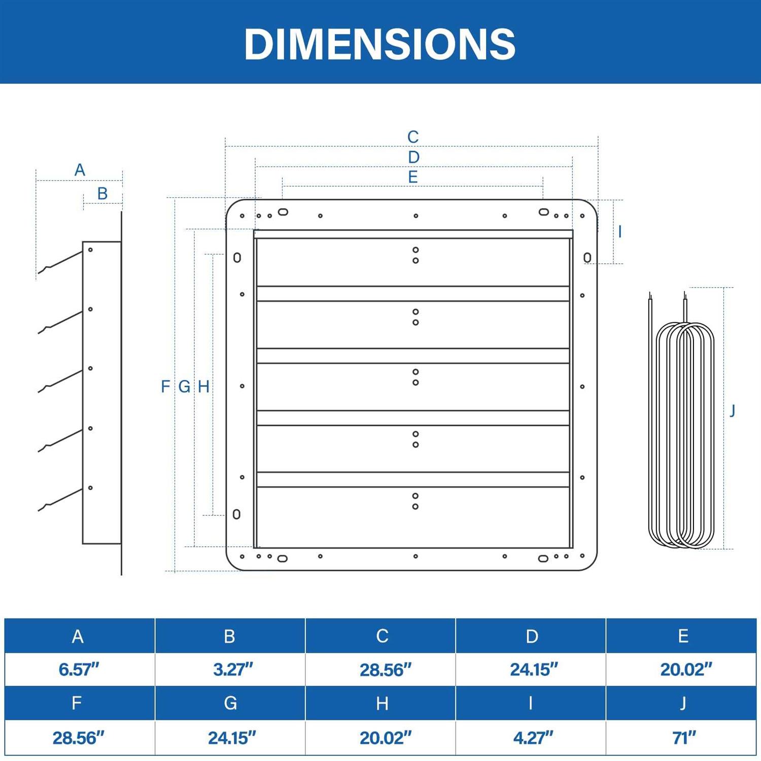 * INSTALLATION: Can easily be added to a window opening or opening in the wall along with a thermostat to optimize cooling. * COOLING AND GVENTILATION: This industrial grade shutter fan can solve all your cooling and ventilation needs. Wattage (watts):170 * RUST PROOF ALUMINUM SHUTTERS: This shutter fan is made with corrosion resistant aluminum shutters and blades. This provides longevity to the fan and will prevent any rust from forming. * 170W, 11V~60Hz, 1.21A, 1400RPM, 2750CFM