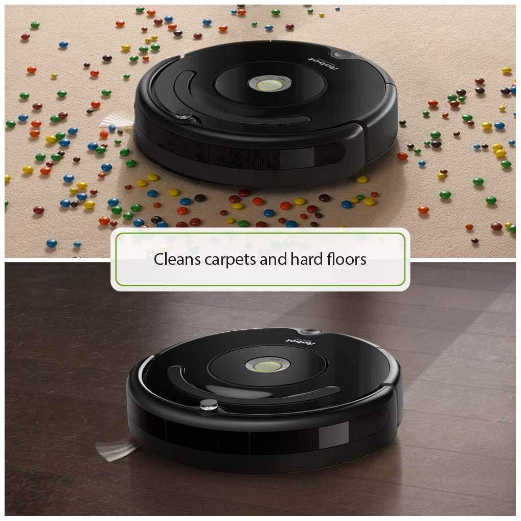 Connect to clean from anywhere with the Roomba 675 robot vacuum. The patented 3-Stage Cleaning System is specially engineered to loosen, lift, and suction everything from small particles to large debris from carpets and hard floors. Just press Clean or schedule Roomba on the go with the iRobot HOME App. Cliff Detect sensors prevent the robot from falling down stairs or tumbling over drop-offs.