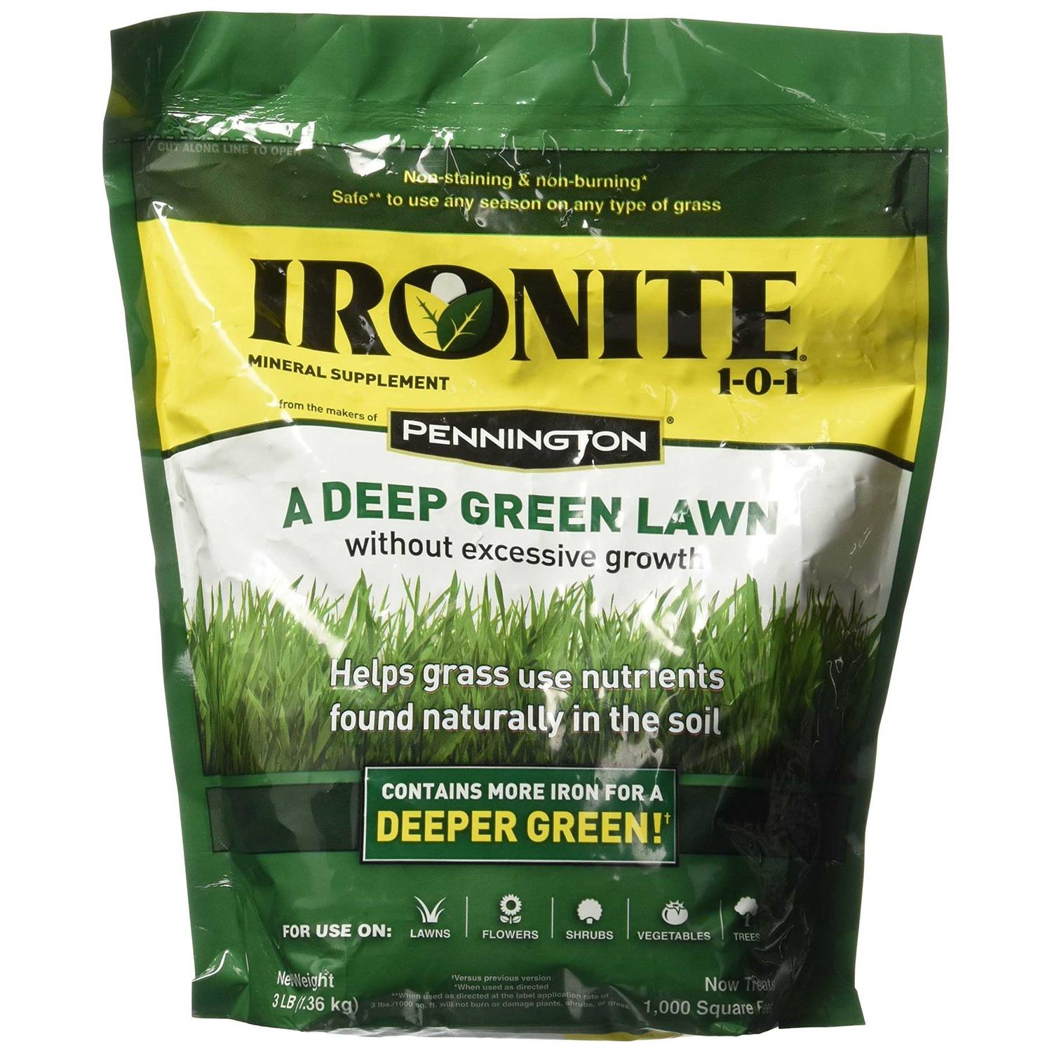 Ironite Mineral Supplement from the makers of Pennington 1-0-1 helps grass use nutrients found naturally in soil. This unique formula is enhanced with beneficial microbes to increase the organic activity in the soil; this activity helps plants use the ingredients in this product more effectively and efficiently. Use this product to green up your lawn and garden.
