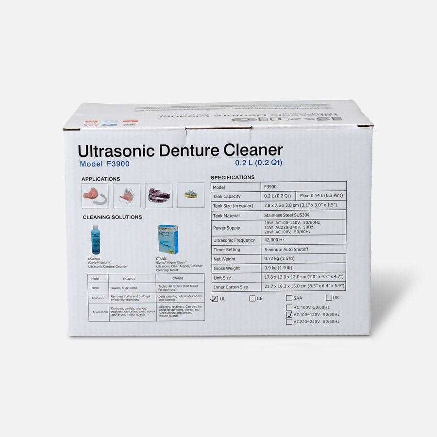 Ultrasonic Denture/Retainer Cleaner White F3900 – It cleans denture retainers includingInvisalign night guards etc. deeply and thoroughly. AC powered trueultrasonic cleaner. Much more powerful and effective than battery operatedsonic cleaners. No need for daily brushing anymore. One button to push with5-minute auto shut off and it is done. Use tap water for daily cleaning.Denture cleaning tablets or solutions can be used for enhanced cleaning tohelp to remove buildups and stains. Cleans small jewelry too. Polishedstainless steel tank for easy cleaning and maintenance. Small size to fit on acounter by a sink. Tank size triangular3.1×3.0x1.5 / 7.8×7.5×3.8 cm. Unit size 7.0×4.7×4.7″. Power 20 W 110 V.Accessories included: plastic tray. White color with blue lid. Blue LED light.5 international safety certifications including GS for Germany which has thetoughest safety standard assure highest quality.Only Amazon and Joy4Less areour authorized dealers on Amazon for this product.