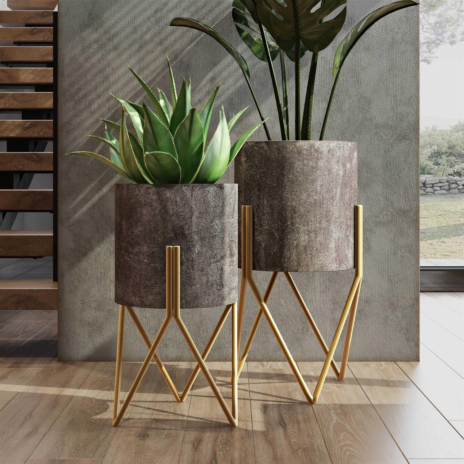Blending glamorous gold finishes with the cool tones of cement, this set of metal planters is an industrial lover’s dream. Each planter features a cracked dark grey finish and has a nice rounded shape encased in a set of brilliant gold legs. Industrial and modern spaces will get a bit of sparkle when you add these stately pieces as a plant holder or hearth decor.