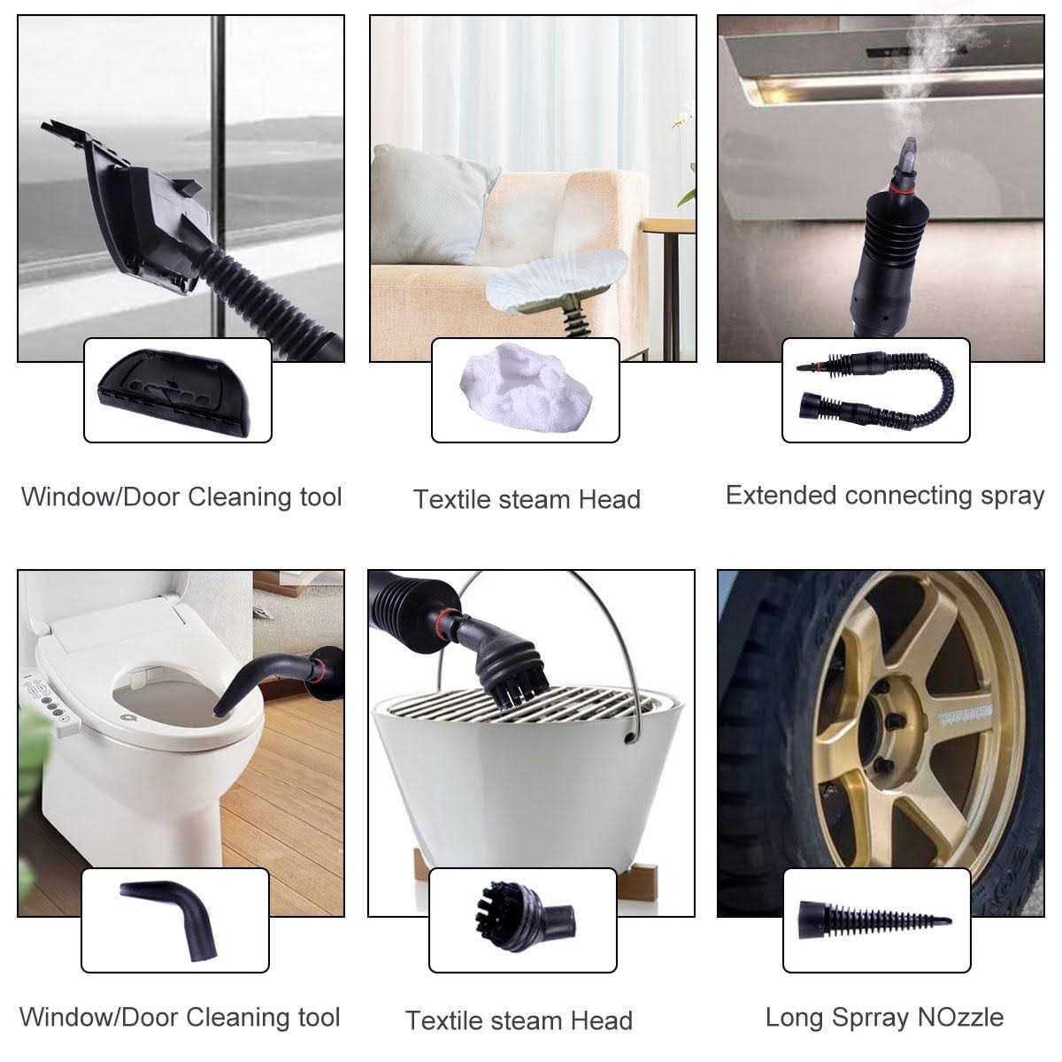 Features: Jaxpety 1050W of power makes cleaning jobs easy; versatile and perfect for indoor and outdoor use 100% chemical free with no harmful fumes; easy and environmentally-friendly sanitizing in seconds Great for cleaning sinks, stoves, counter tops, refrigerators, kitchen, floor, living room, windows, toilet Comes with an exclusive free 9 piece accessory kit which includes: Extended Nozzle, general spray nozzle, Bent Spray, Funnel, Measuring Cup, Spray Cup for Door & Window, Towel Sleeve, Round brush nozzle, and Long Spray Cup 1050W of Power; Emits pressurized powerful hot steam (250-270F) for up to 20 minutes Descriptions: It is made into handheld and compact size for convenient operation. With a large capacity of 400mL, it could accommodate plentiful water so that you don’t have to fetch water for several times. High pressure steam design makes this machine quite labor-saving. It is mainly used for cleaning glasses, removing greasy dirt or sterilizing bacteria etc Specification: