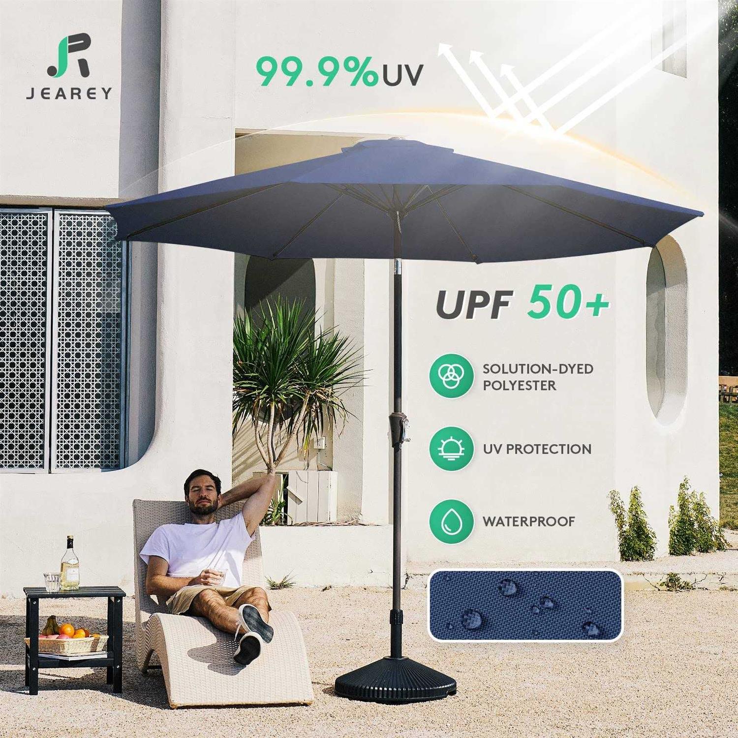 ATTENTION: Due to different screen display, there may be a little color difference from image. If there is any issues on it, please feel free to contact via email MULTIFUNCTIONAL CANOPY: 9FT outdoor umbrella would shades you with at least 4-6 chairs and table, ideal for both residential and commercial location. High-density polyester is WATER & UV RESISTANT. Double-layer Vent enables essential wind and heat to ventilate and makes the umbrella remain stable and grounded STURDY & DURABLE: JEAREY always puts safety first. To reduce swaying and increase overall strength of our umbrella, the entire structure of yard umbrella is made of sturdy iron material. Powder coated iron pole and 8 sturdy ribs provides stronger support and are built for stability EASY TO ADJUST: Open, close and tilt the umbrella with ease! The deck umbrella is designed with a crank system for easy opening and quick use. Push button tile allows for more angles for shade protection and allows for coverage all day MULTI VERSATILITY: 9 Feet diameter large umbrella shade better for Market, Garden, Deck, Backyard, Pool and Patio Table. Enjoy your coffee time in the gentle breeze and Sunlight will never shine your eyes all the day RECOMMENDED TABLE TRAY & BASE: The patio table tray (SOLD SEPARATELY, ASIN: B0BMTMQR8T), base stand (SOLD SEPARATELY, ASIN: B0C4Y6233D) can better meet your needs at your leisure time by pool.