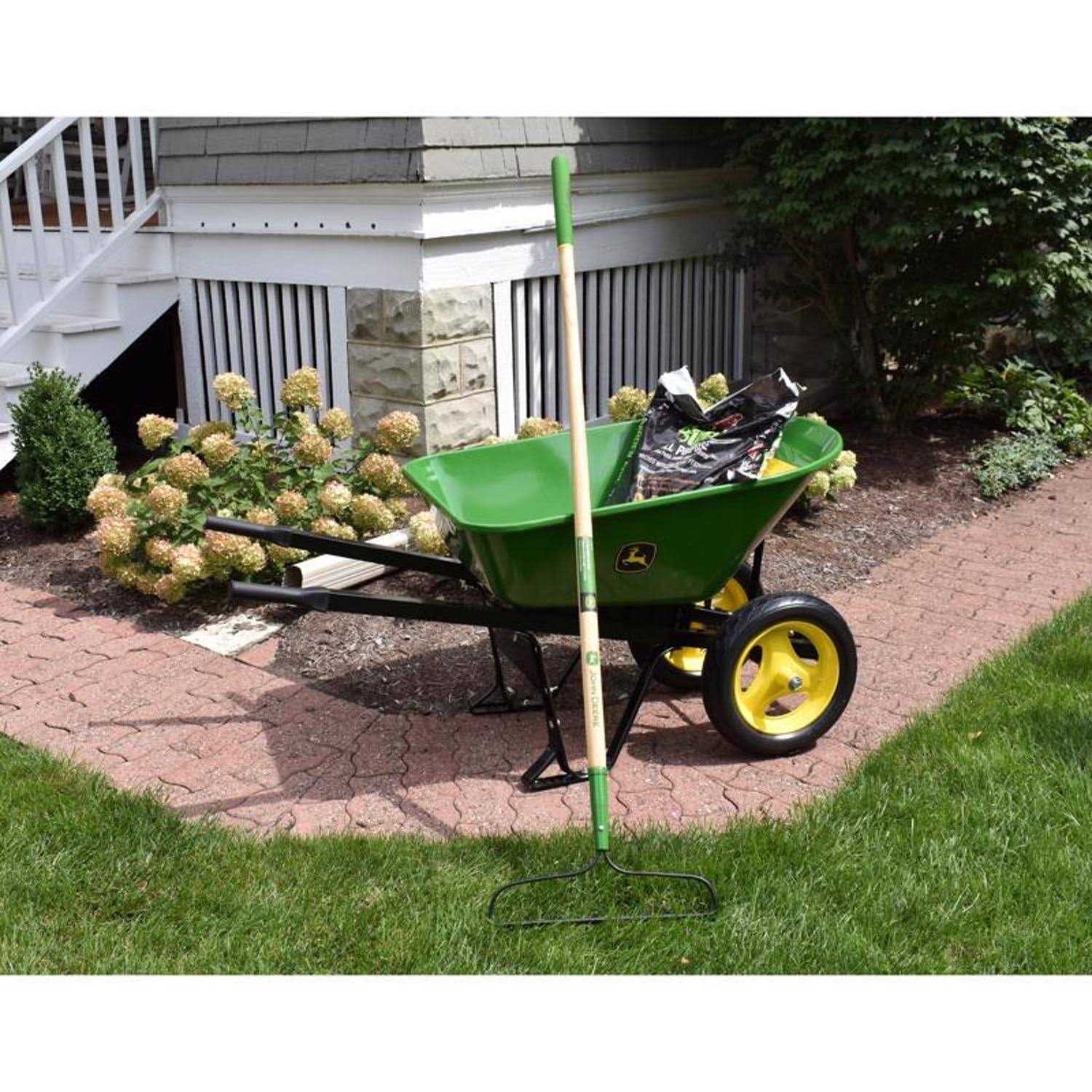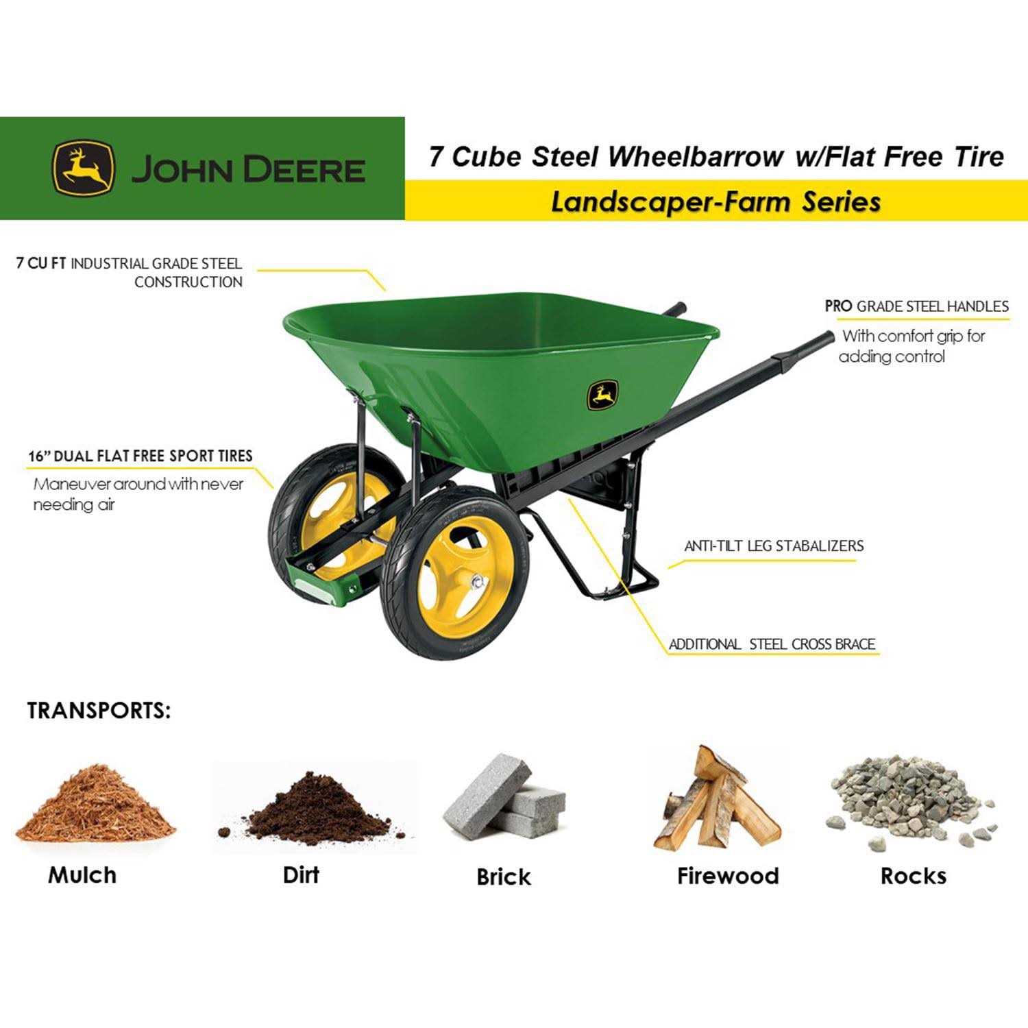 Ft. steel tray wheelbarrow helps you get your outdoor jobs done with ease and stability. Great for mulching cleanup hauling leaves wood rocks and stone. Great wheelbarrow for working with hay and other materials in barns and around stalls. Its dual wheels sturdy steel handles and comfort grips make it a great choice for handling all your outdoor needs. Comes with dual flat free tires so you never have to fill them again.