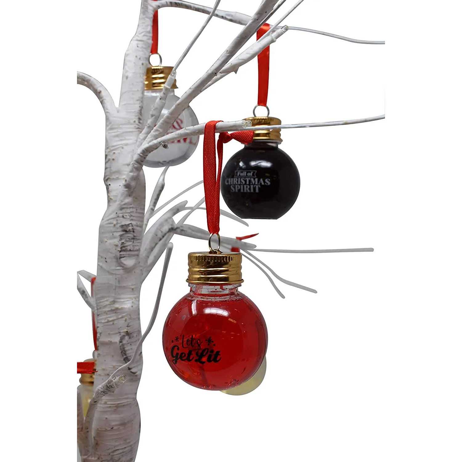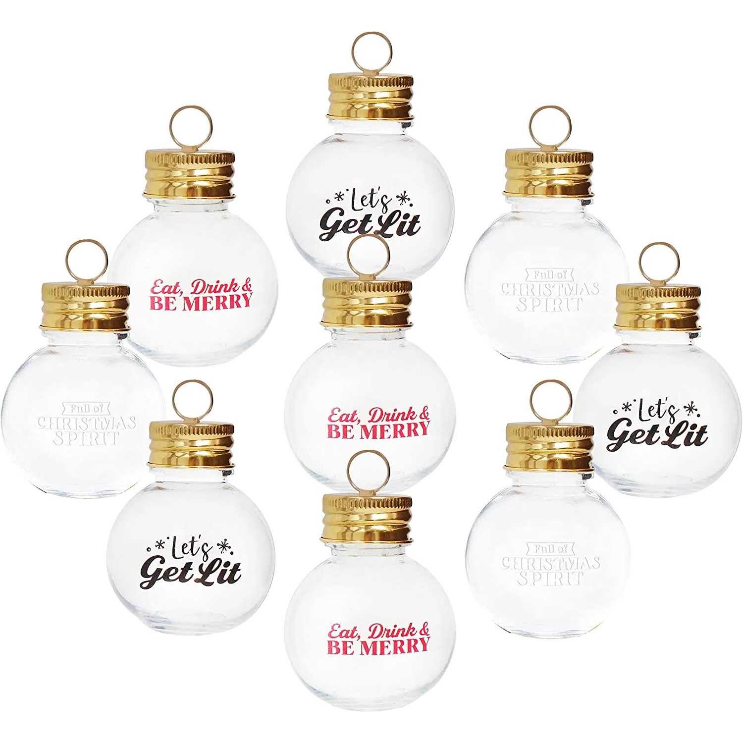 Item Includes: 9 x ornaments: 3 x ‘Eat, Drink & BE MERRY’ 3 x ‘Full of CHRISTMAS SPIRIT’ 3 x ‘Let’s Get Lit’ Red ribbon. Sizing: 5cm / 1. 77 in diameter. 50ml / 1. 7oz Please note: Item includes ornaments and ribbon only. Tree and other decorations not included. On the first day of Christmas, my true love sent to me… Skip the the french hens and turtledoves and get your loved ones what they really want–a drink. These transparent Christmas ornaments double as little drink bottles or baubles, and can be filled with a drink of your choice. Each container is 5cm (1. 77 in) wide and can hold approximately 50ml (1. 7oz) of fluid. Included are 9 baubles, plenty for a party. So, what are you waiting for? Eat, drink and be merry!