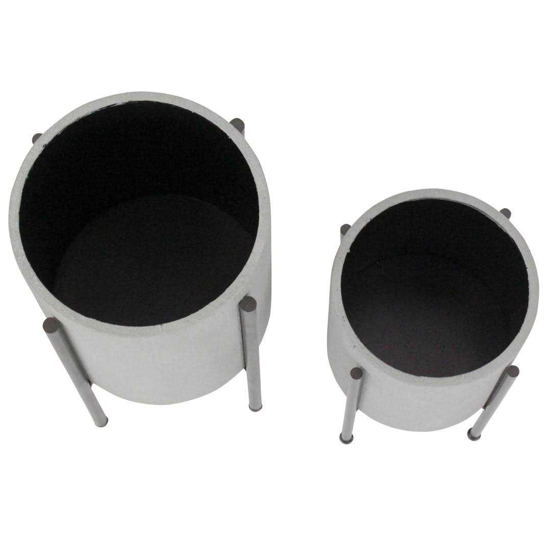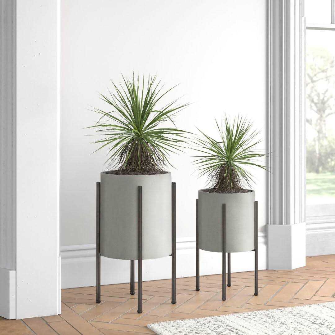Give your house plants the tender loving care they deserve with this set of two planters. Each cylindrical pot features a stucco-like texture and streamlined metal stand in your choice of versatile finish, plus watertight construction for mess-free watering. Go ahead and style these pots together or apart, and don’t stop there – to build on your indoor garden, try mixing and matching different planters for a layered look. Tip: When repotting, adding rocks below your soil helps promote healthy root growth.