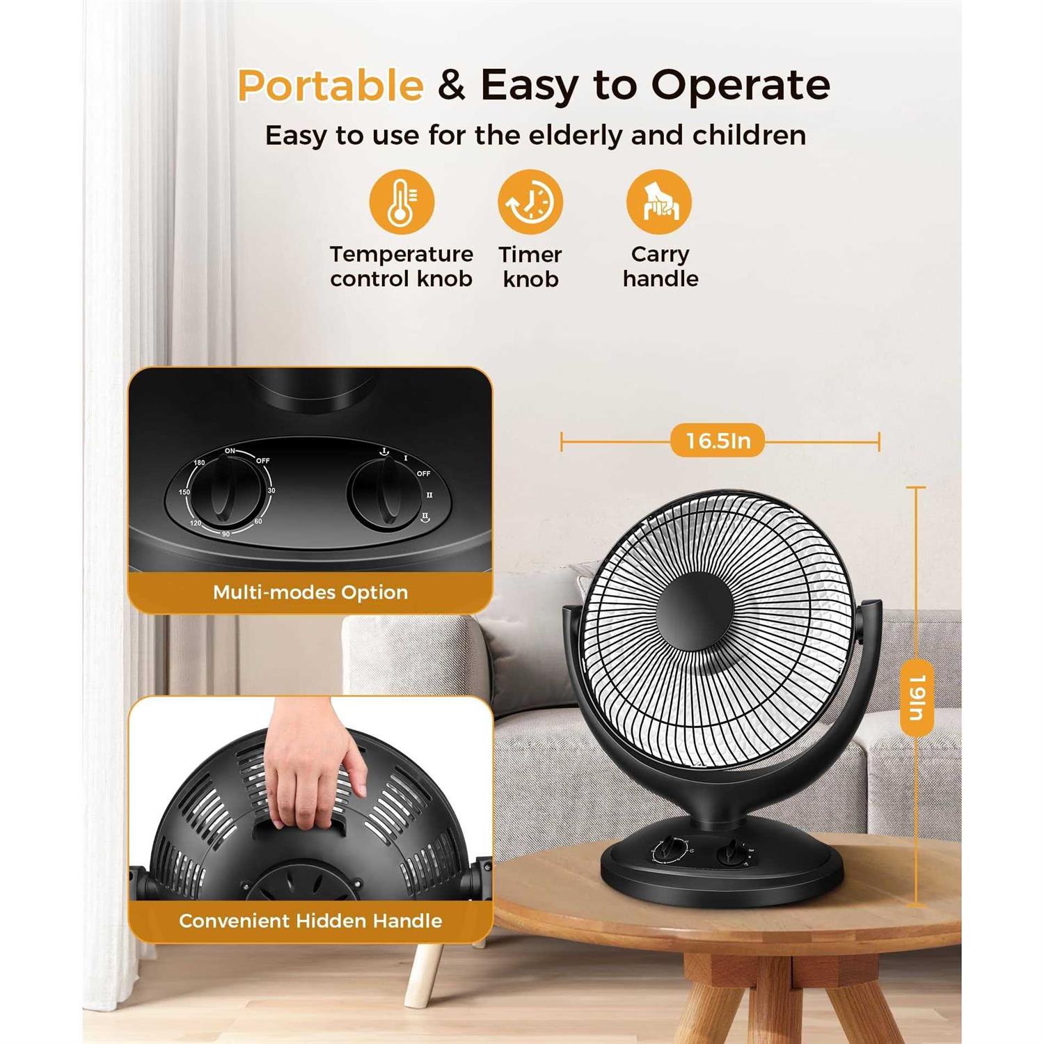 Brand: Joy PebbleColor: BlackFeatures: 【Dual-gear fast & Efficient Heating】Joy Pebble space heater has a heating power of up to 800W, which allows it to heat up the space quickly. There are two power levels of 400W and 800W for you to adjust to meet your different temperature needs. 【Tipping & Overheat Protection】Not only does Joy Pebble electric heater have overheat protection and tipping protection, but it is also ETL certified, which ensures that you are in a safe and warm environment. 【Oscillating & Adjustable Tilt】Joy Pebble radiant space heater is equipped with a 65-degree oscillating mechanism that can heat up to 162 square feet of space. The tilt angle can also be adjusted to ensure user comfort. 【Work Quietly & Energy Efficient】The energy efficient space heater does not make any noise when it works, so you can totally use it while working or sleeping. In addition, Joy Pebble space heater has a 180-minute timer function to efficiently heat the space and save energy at the same time. 【Easy to Operate & Carry】Joy Pebble portable heater has only two knobs, which makes it easy to operate and can be used by both the elderly and children. It also comes with a hidden carrying handle, bring it wherever you go, and you can make heat anytime and anywhere. model number: JP-R5315EAN: 6976100503953Package Dimensions: 20.0 x 15.0 x 10.0 inches