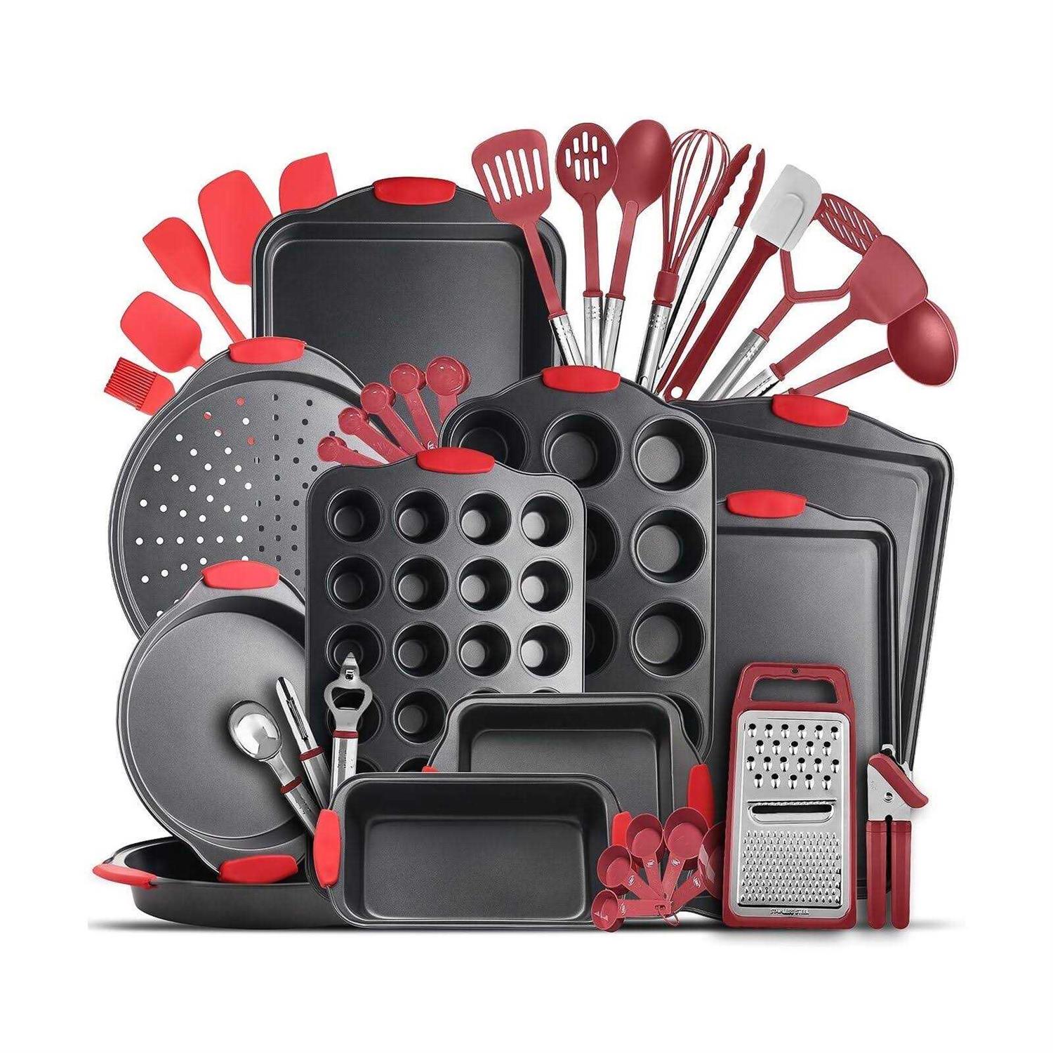 Eatex 39-Piece Nonstick Black Steel Bakeware Set with Red Utensil and Silicone Handles