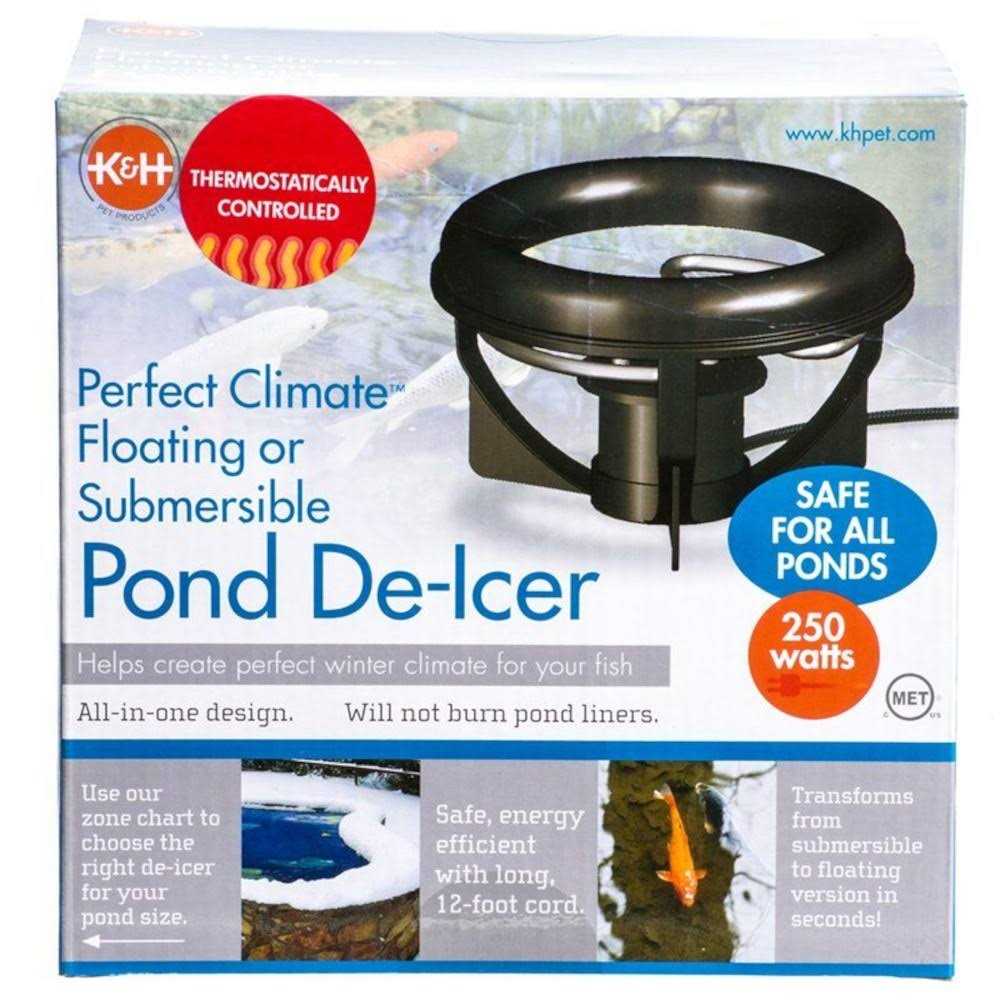 Floating or submersible in 1 convenient de-icer. Thermostatically controlled to keep your pond from freezing. Safe in all ponds and will not harm pond liners. Easy to maintain and clean. Includes a 12-ft cord. Operates at 250-watts. This product is ETL listed.