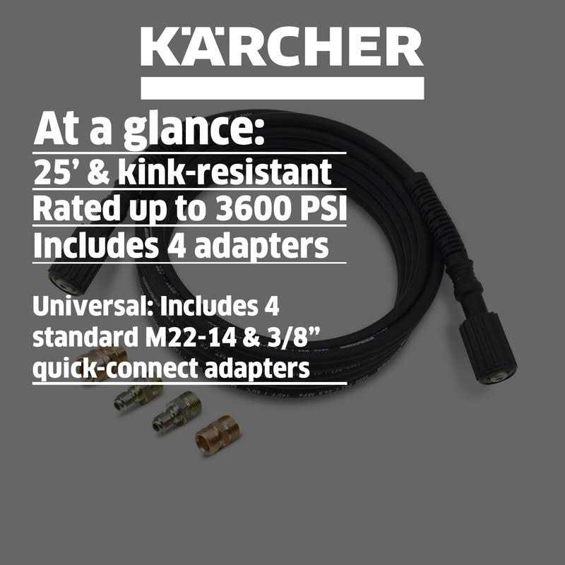 Karcher 25′ replacement hose includes four adapters for compatibility with both quick connect & M22 threaded connections. The 25 foot high pressure hose is rated to 3600 PSI & fits most brands of both electric & gas pressure washers. Compatible with Karcher gas models rated up to 3600 PSI and Karcher electric models K1700-K2000. Does not fit Karcher electric models K2-K5. FeaturesKarcher 25′ replacement hose includes four adapters for compatibility with both quick connect & M22 threaded connections. The 25 foot high pressure hose is rated to 3600 PSI & fits most brands of both electric & gas pressure washers. Compatible with Karcher gas models rated up to 3600 PSI and Karcher electric models K1700-K2000. Does not fit Karcher electric models K2-K5.