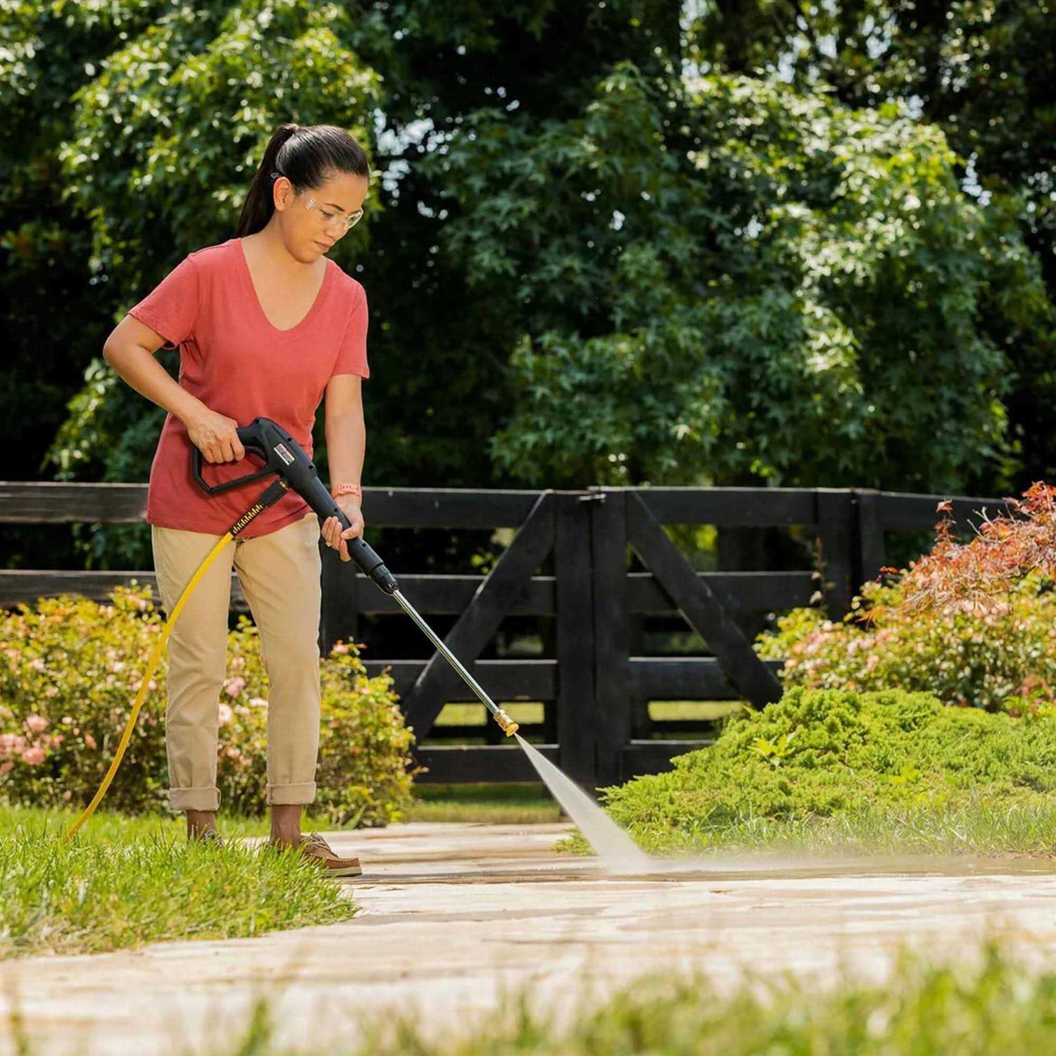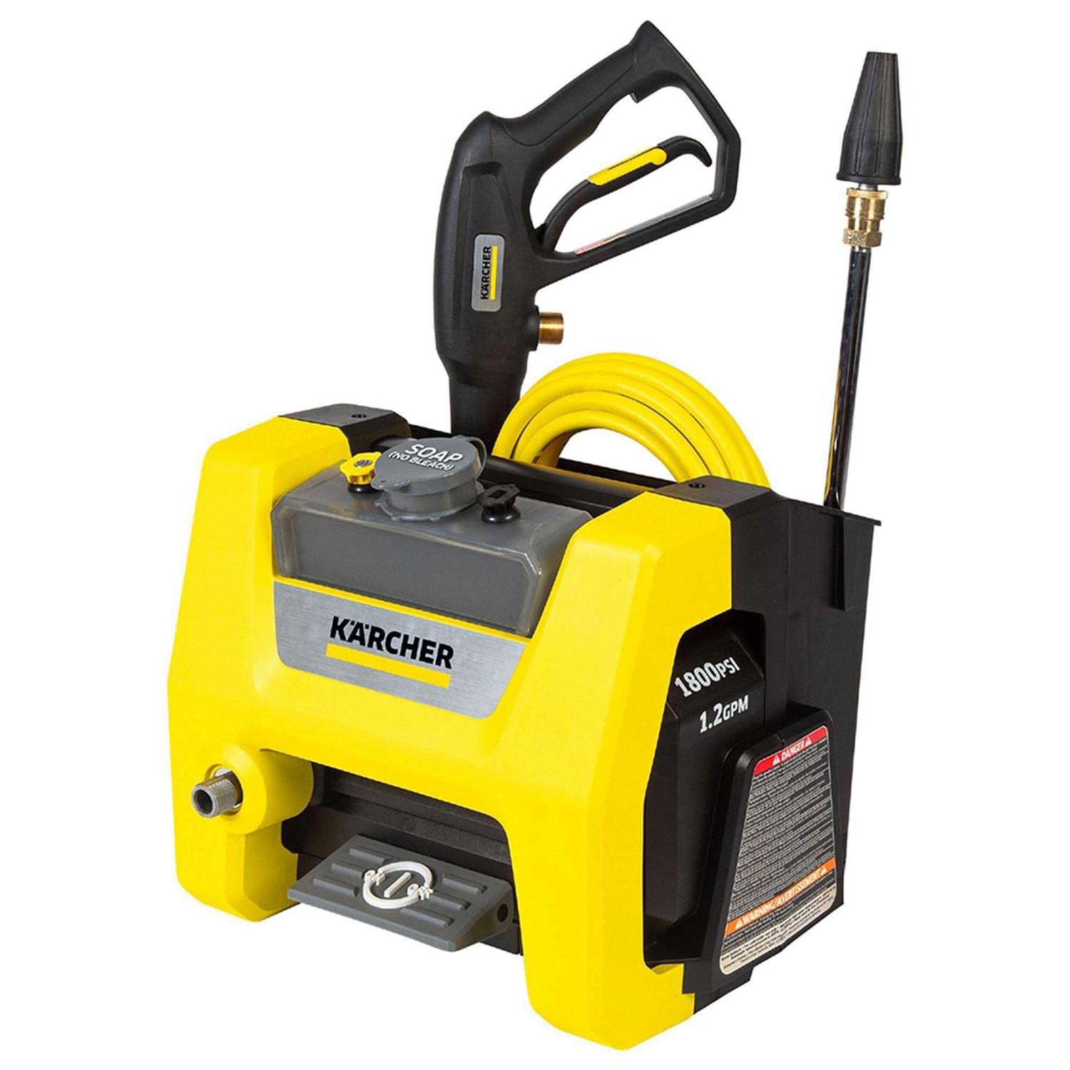 Karcher’s Performance Series K1800PS electric pressure washer was developed to offer high cleaning power and unparalleled ease of use. This electric pressure washer delivers 1800 PSI of TruPressure, ensuring you get a high level of cleaning power driven by a reliable universal motor. It includes convenience features such as a unique on/off foot switch, a handy storage bin, a large half gallon removable detergent tank and three spray nozzles (including a turbo nozzle for intense cleaning). Metal hose connections, a sturdy spray wand and an integrated black aluminum frame make this high pressure washer highly durable. With 8 inch never flat wheels, the machine is very easy to maneuver over even difficult terrain. Universal quick-connect nozzles and standard M22 hose connections simplify nozzle and accessory usage. Best of all, no tools are needed for assembly. You can set up and start using the K1800PS in five minutes or less! Karcher electric models of pressure cleaners offer solid cleaning ability that is high on value and big on performance.