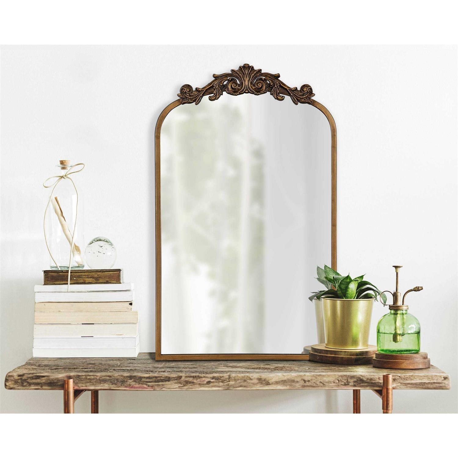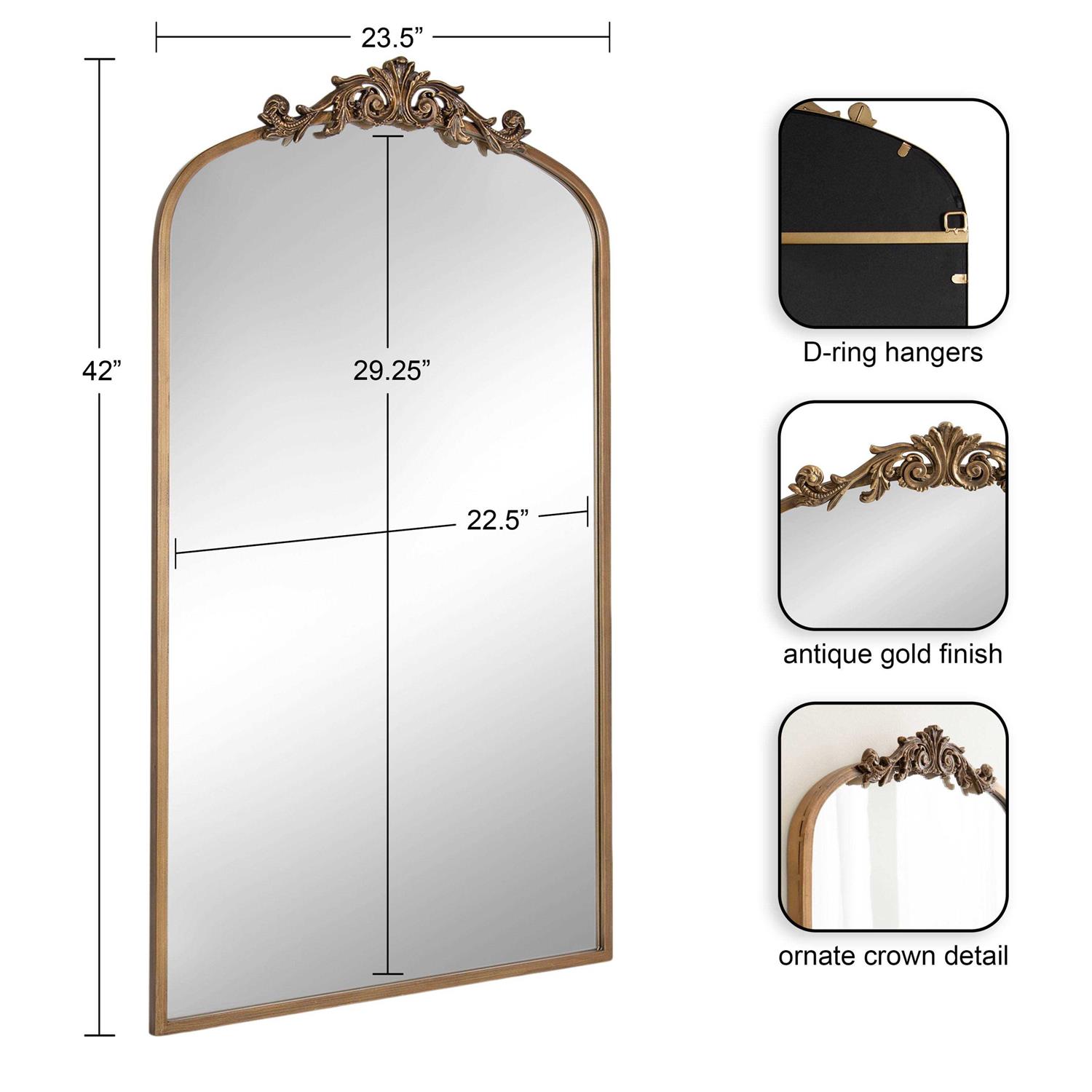 The Arendahl tall panel mirror brings decadent charm to your traditional home decor. This mirror features a baroque-inspired design, with a resin garland crown cascading down an arched iron frame. The antique gold finish brings it together as a vintage piece to display anywhere in your home. Due to its hand-finished craftsmanship, each piece may vary in appearance. Showcase it in your living room, bedroom, entryway, bathroom vanity, or dining room. Use the fabulous Arendahl mirror to bring dimension to your smaller spaces, opening up the area and illuminating the darker corners. Proudly exhibit the Arendahl mirror on its own or in multiples. Measuring 24 inches wide by 42 inches tall, the Arendahl provides enough space to create a fantastic focal point. For simple, quick wall mounting, the Arendahl also features metal D-ring hangers for secure installation. There’s no better way to bring an elegant, old-school design aesthetic to your wall decor than with this beautiful accent mirror. Dazzle your guests with this stunning panel mirror that is perfect for a bright, vintage addition to your space.