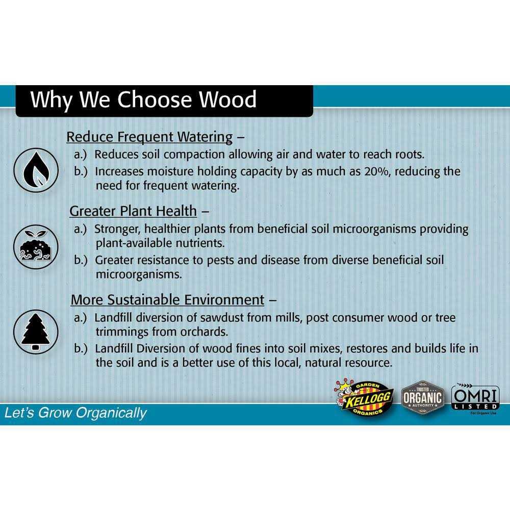 Kellogg Garden Organics All Natural Garden Soil for Flowers and Vegetables revitalizes native soil found in your in-ground garden bed. Our special blend with aged wood fines looks different than conventional peat-based soil mixes, but perfectly formulated for in-ground planting of flowers and vegetables. HOW TO USE: Mix 50: 50 with the native soil in your garden for in-ground planting only (no containers). All Natural Garden Soil helps reduce soil compaction and retain moisture, reducing the need for frequent watering. Wood fines also attract beneficial soil microbes which aid your plant s resistance to pests and disease, promoting lush plant growth. And don t forget to add an organic fertilizer for slow-release of nutrients throughout the growing season.
