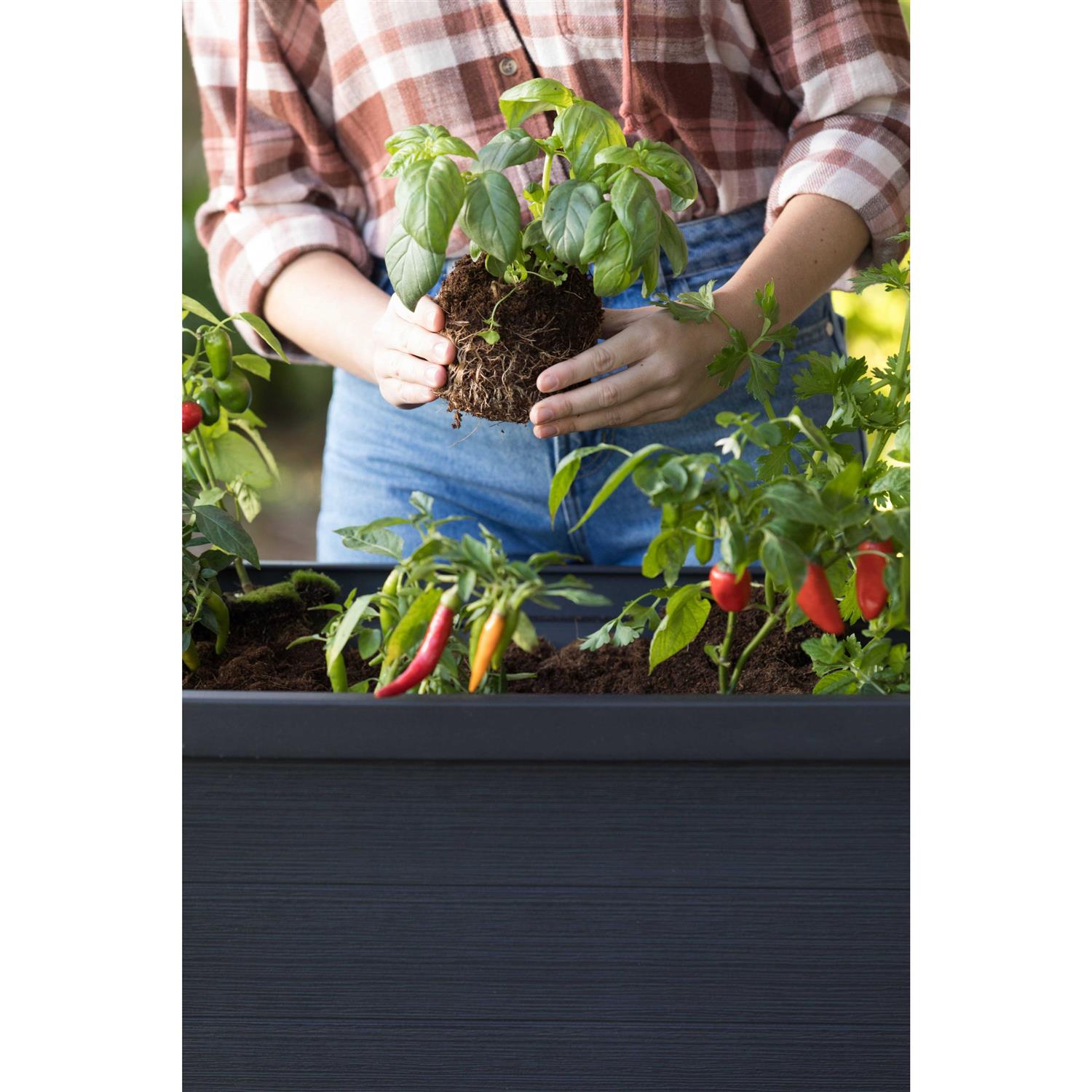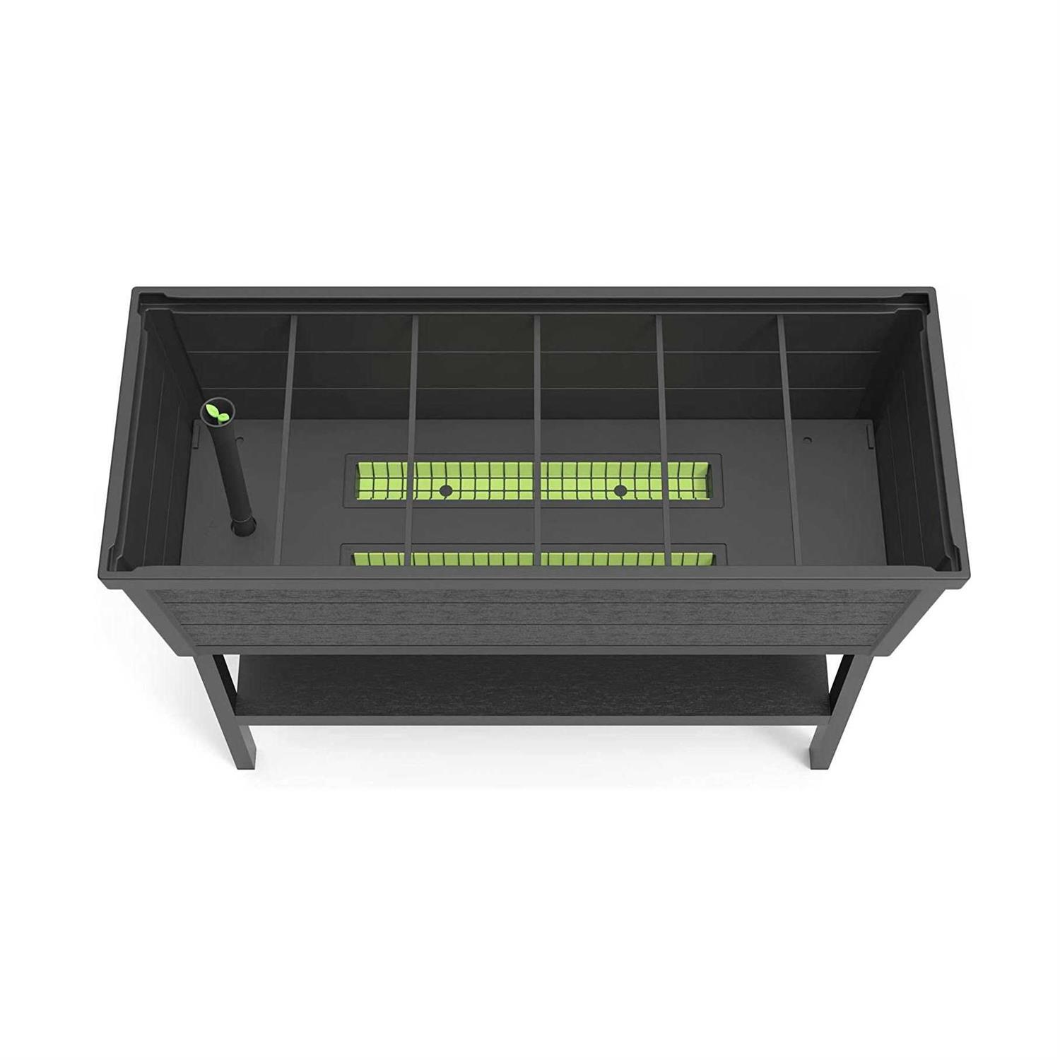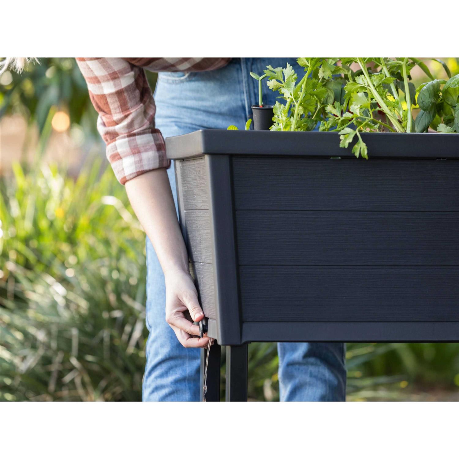 Take your gardening efforts to the next level with the Wood Look Garden bed, an elevated garden from Keter. You don’t need a house in the country to enjoy farm fresh produce and herbs. Whether you want to become more self-sufficient, reduce grocery costs or just savor the flavor of freshly picked fruits and veggies-our planter offers easy access to nature’s bounty in suburban or urban settings. The Wood Look Garden Bed from Keter is a versatile, convenient option for gardeners with a variety of needs. The sturdy resin planter allows city dwellers to grow flowers, herbs, fruits, and vegetables in even the most limited spaces. The raised bed enables those with arthritis, injuries or disabilities to garden with little or no bending, kneeling or crouching. And the self-watering system and water gauge make it easy to stay healthy while enjoying freshly picked ingredients for all your meals. The Perfect Accent for Any Outdoor Space The planter is designed to be an attractive addition to your outdoor decor. Large enough to accommodate plenty of soil for growing your favorite juice or smoothie ingredients, it’s also compact enough to fit comfortably with your patio furniture and grill. Its smooth lines add a modern touch to your outdoor living space, and its wood-look exterior blends beautifully with most patio furniture. Heavy-duty resin construction means no rusting or rotting, and the UV protected material prevents fading, even after years of sun exposure.