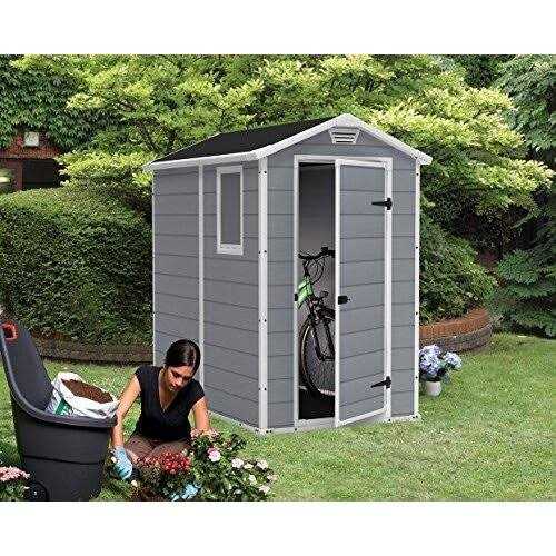 This tough plastic shed won’t ever rot, peel or dent, unlike its wooden and metal competitors. Furthermore, the double door at the front of the shed makes it easy to get big items in and out of the shed without strain or hassle. This Manor 4′ x 6′ shed has an internal storage capacity of 131.8 cubic feet. We think you’ll find that plenty roomy enough to fit your garden supplies, tools and other odds and ends that might be lying around your yard. The shed also has a fixed window on the side and a ventilation vent at its peak. These features prevent the shed from becoming too musty during hot or wet weather. Not only is this shed functional, it’s also easy on the eyes. – Dimensions (W x D x H): 76″ x 51″ x 78″.