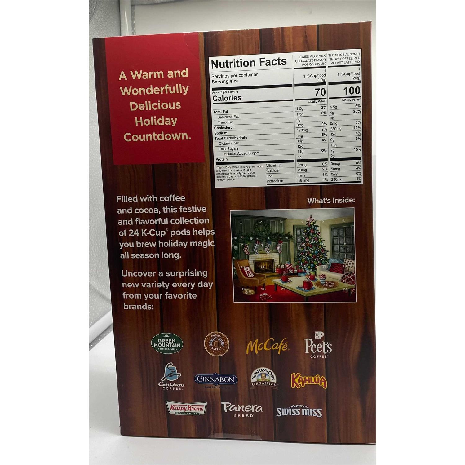 Introducing the 24 Cups of Cheer Keurig K-Cup Pod Advent Calendar – a warm and wonderfully delicious holiday countdown. Filled with coffee and cocoa, this festive and flavorful collection of 24 K-Cup pods helps you brew holiday magic all season long. Introducing the 24 Cups of Cheer Keurig K-Cup Pod Advent Calendar – a warm and wonderfully delicious holiday countdown. Filled with coffee and cocoa, this festive and flavorful collection of 24 K-Cup pods helps you brew holiday magic all season long. Variety Pack of coffee, artificially flavored coffee, cocoa mix, latte beverage mix Contains genuine Keurig K-Cup pods, engineered for guaranteed quality and compatibility with all Keurig K-Cup pod coffee makers Recyclable K-Cup Pods. Simple. Delicious. And now Recyclable. Enjoy the same great-tasting coffee you know and love, and when you’re done just peel, empty, and recycle. *Check locally, not recycled in all communities.